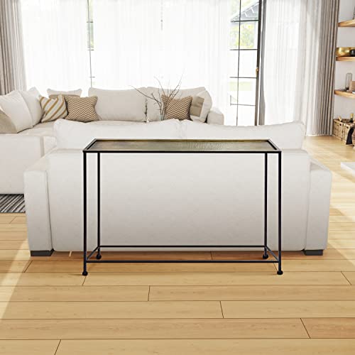 The Urban Port Aurelia 48-Inch Console Sofa Table, Artisanal Hammered Antique Bronze Tray Top, Industrial Black Iron Frame