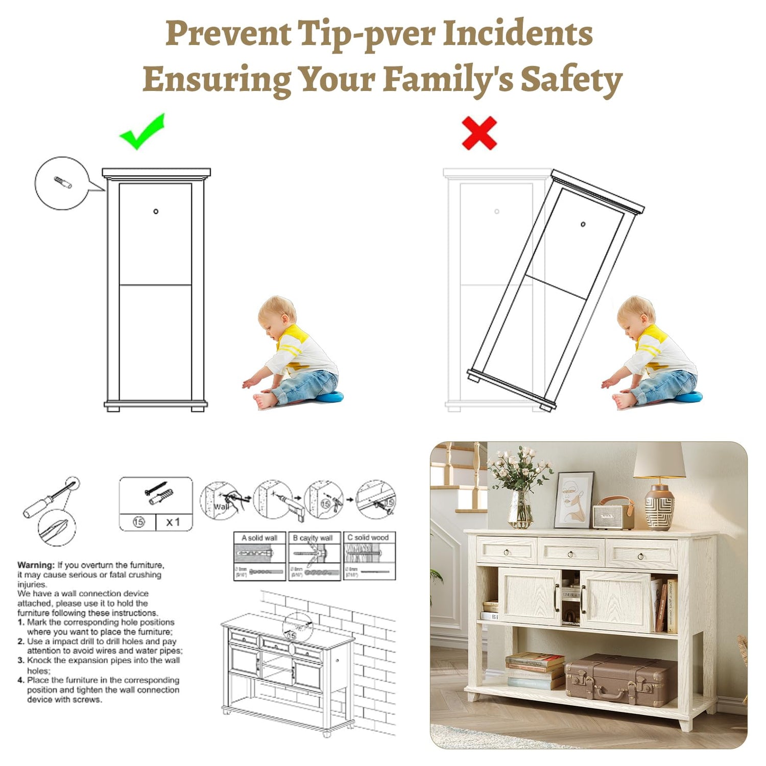- Large Storage Space: Farmhouse entryway table size 47.4 "L *15.5 "W * 34.2 "H. Featuring a spacious table top, 3 equal sized handy drawers, 2 sliding cabinets, and a large bottom shelf for storage of different sized items. The tabletop and bottom fixed shelf can store larger items such as coffee makers, plants, decorative, books, photos and more