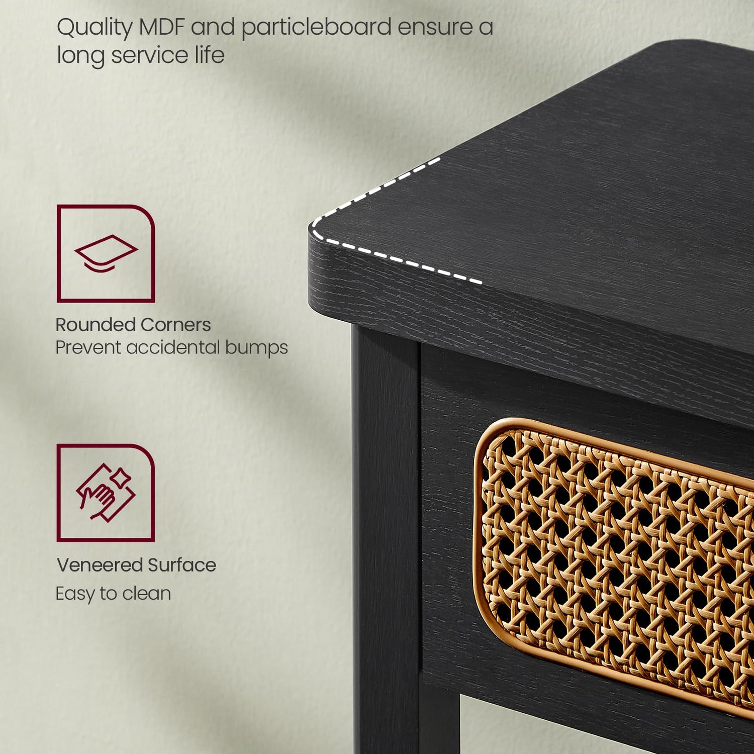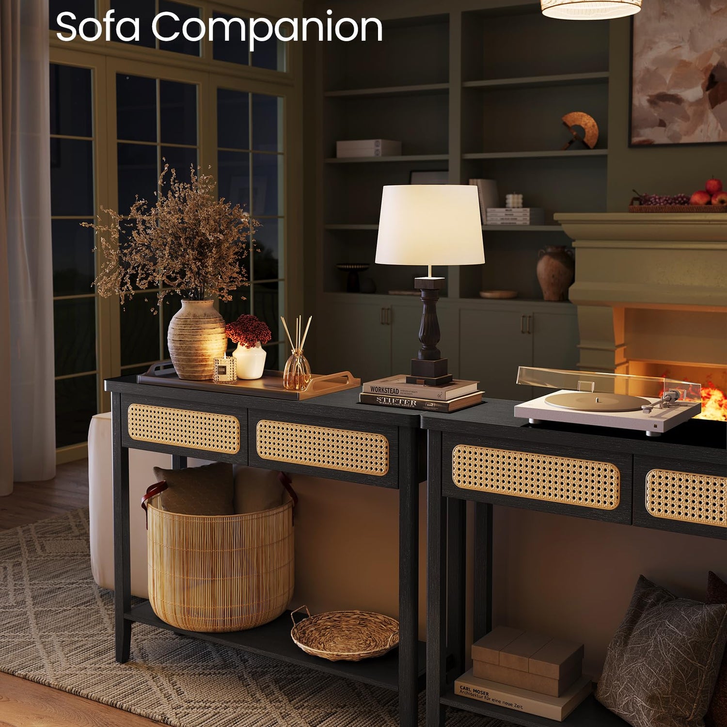- [Invite Boho Charm In] This console table exudes bohemian grace, with a black hue that resonates with natural elements, and the PVC rattan drawer front that adds an extra layer of texture. Perfect for enhancing a modern space or enriching a boho decor