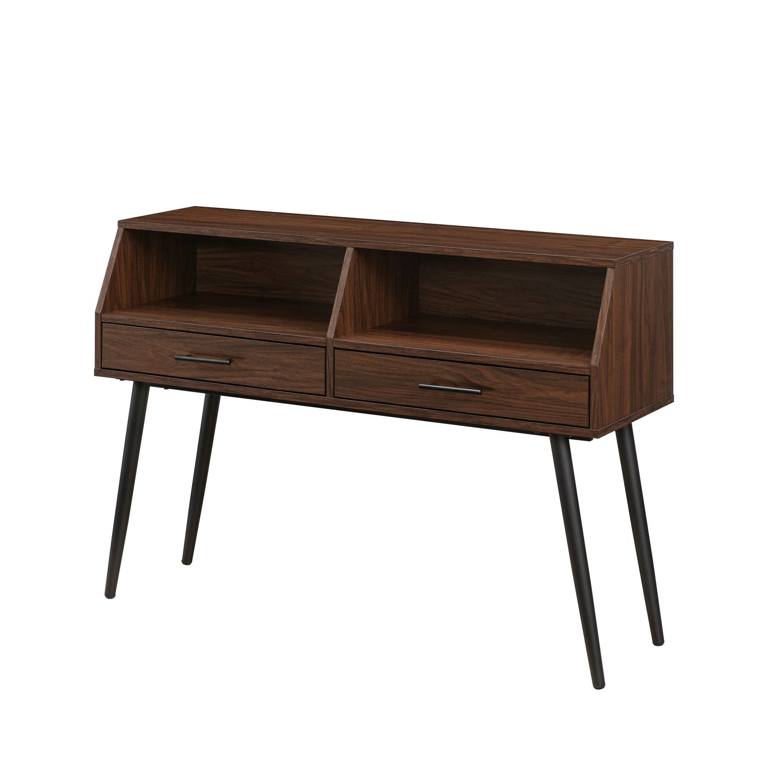 Details: Contemporary contours, minimalist metal drawer pulls, and ample storage: what else could a modern home need? This entry table is both storage savvy and stylish with two drawers on smooth metal glides and the divided open cubby space. With a lightweight frame and small-space-friendly silhouette, this entry table will lend your space an effortless elegance that’s easy on the eyes as well as your budget. Pair this piece with the matching side table and coffee table to curate a cohesive aesthetic throughout your abode.