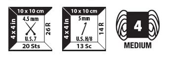 - Medium Weight #4; Worsted yarn. Knitting gauge is 4"=20 stitches on size 7 needles; Crochet gauge is 4"=13 Sc on size H/8 hook.