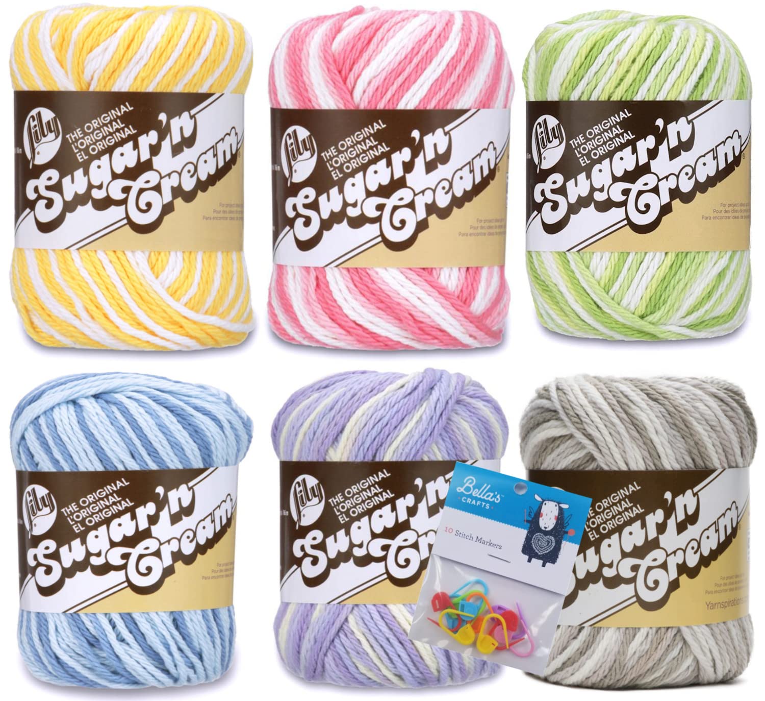 - Lily Sugar'n Cream 100% Cotton Yarn 6-Pack Bundle as shown with Bella's Crafts Stitch Markers.