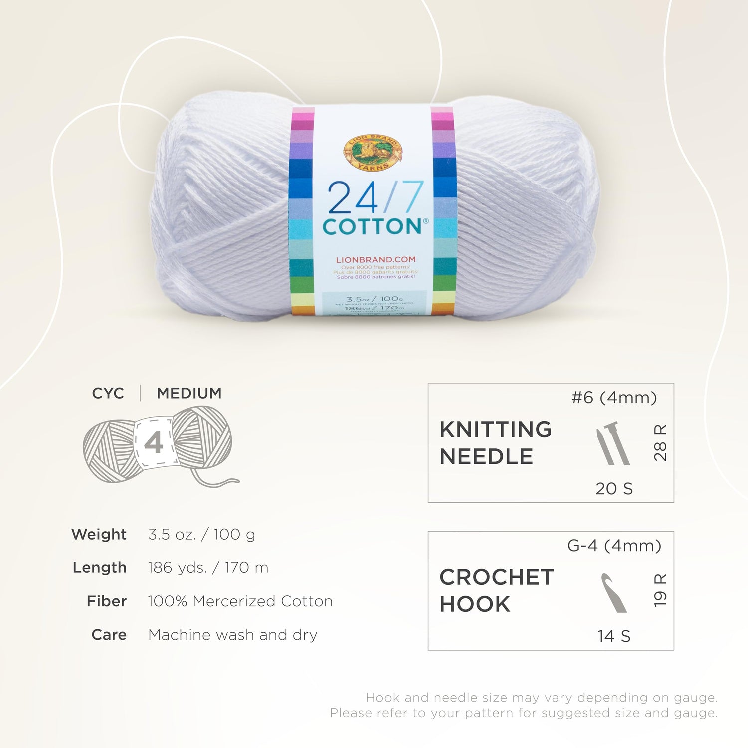 Lion Brand Yarn Lightweight 24/7 Cotton Yarn for Knitting, Crocheting, and Crafts, White, 1 Pack