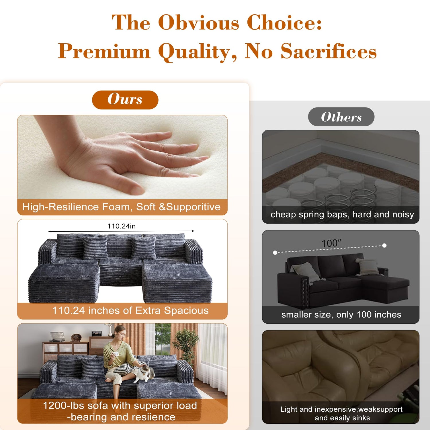 110 Corduroy Modular Sectional Boneless Sofa with 2 Ottomans, Convertible Cloud Couch with Deep Seats, Fluffy Memory Foam U Shaped Couch for Living Room, No Assembly Required, Black (Gray)