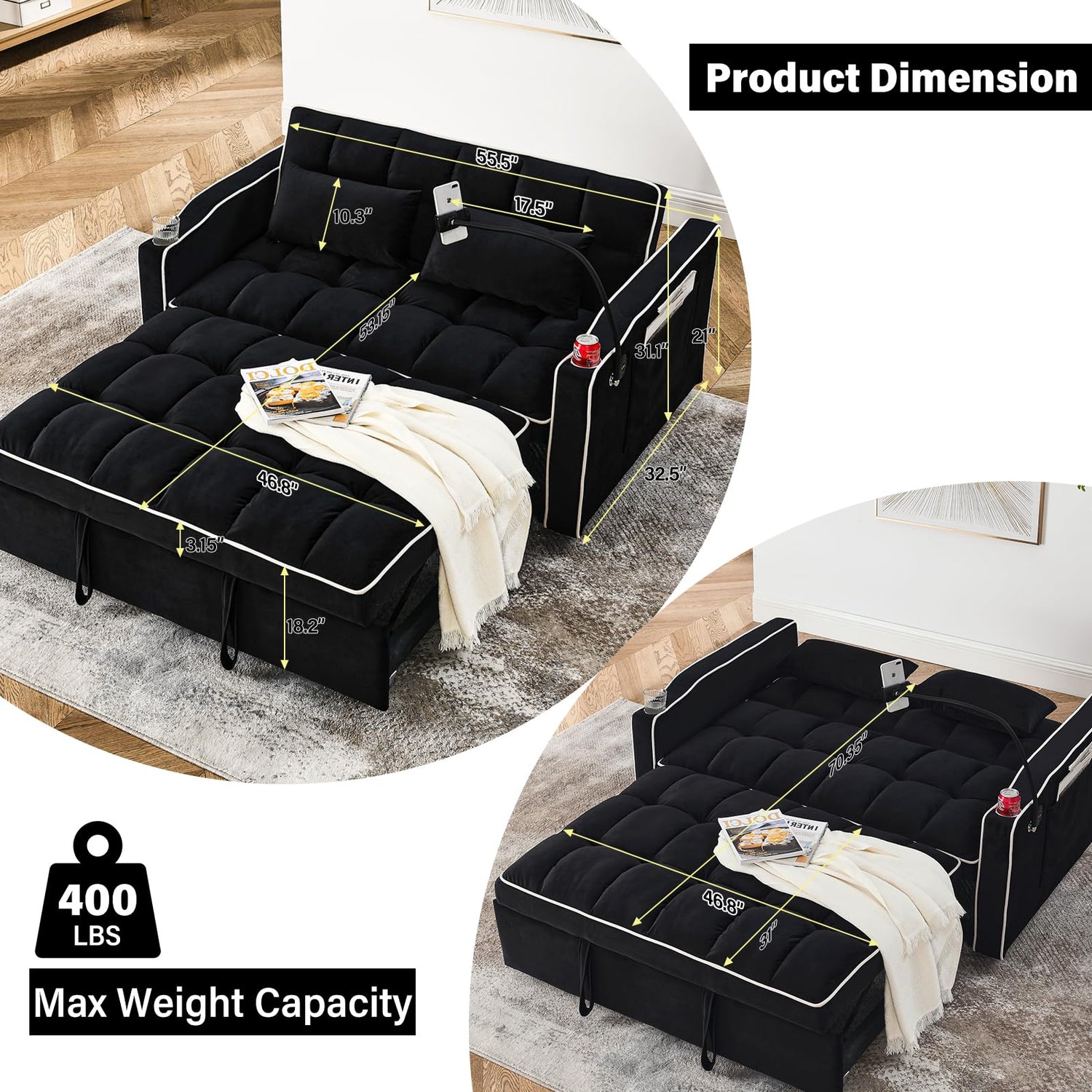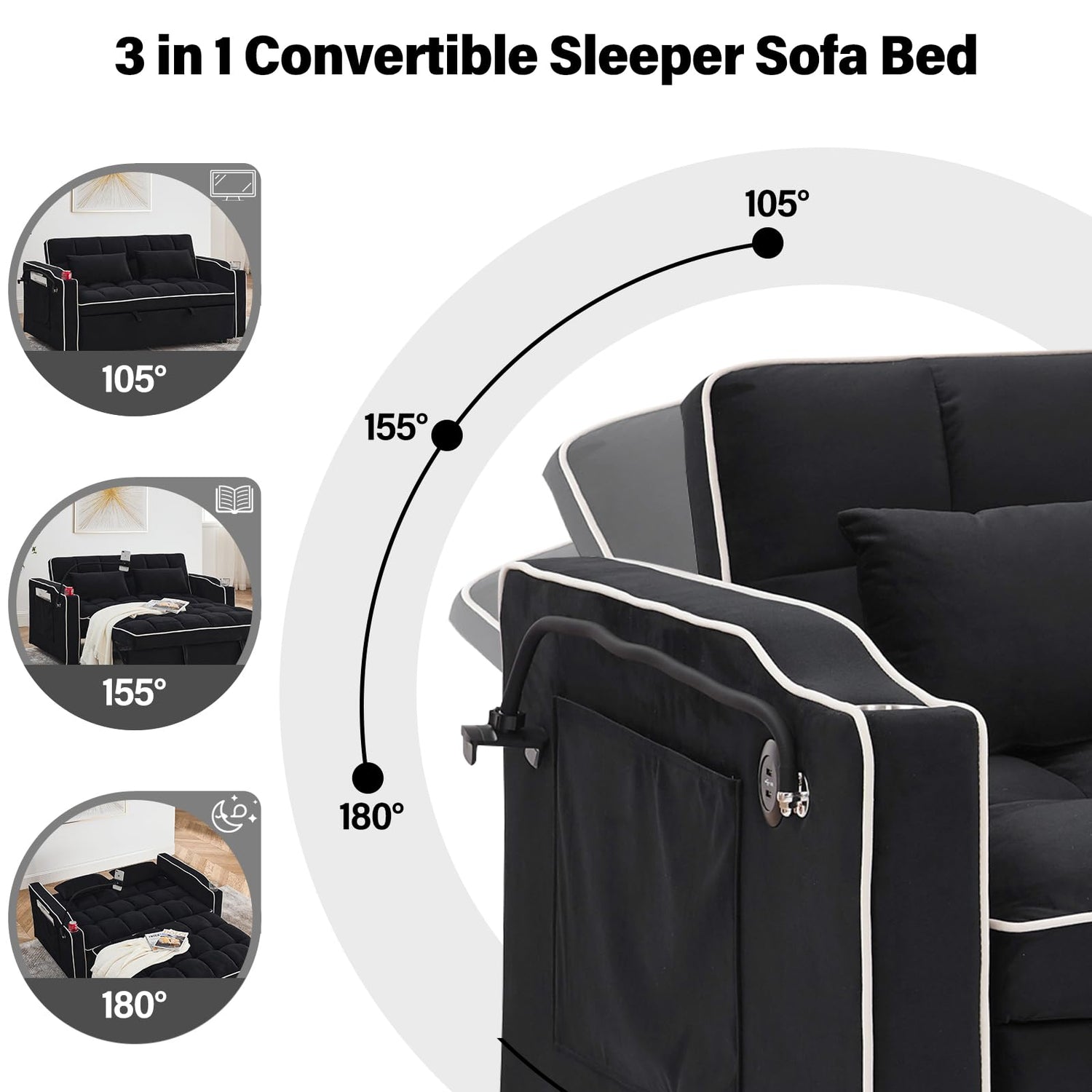3 in 1 Sleeper Sofa Couch Bed,Velvet Convertible Loveseat Sleeper Sofa Bed,Pull Out Sofa Bed With USB Port & Ashtray and Swivel Phone Stand & Storage Pockets,Modern Sleeper Sofa for Living Room,Black
