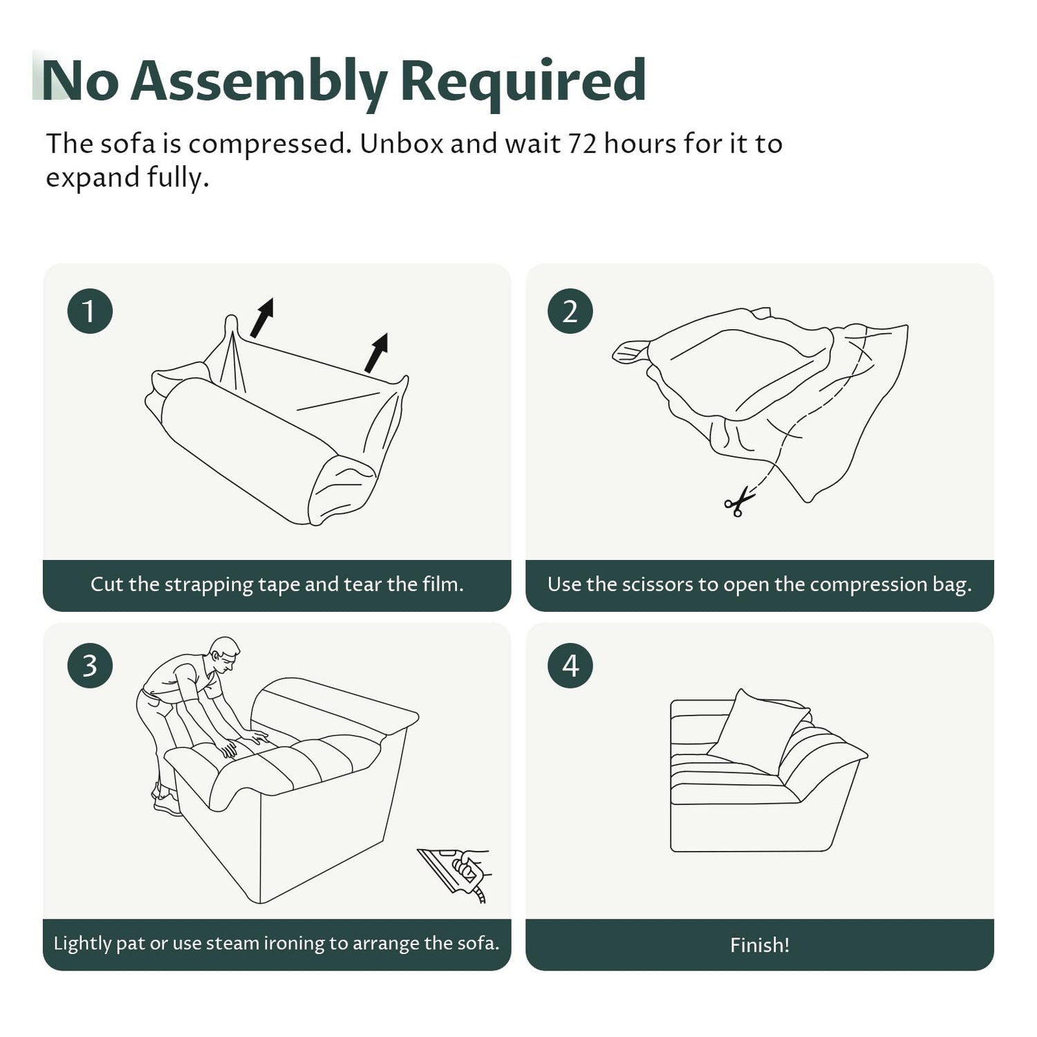 • Quick Setup — No Assembly Needed: Open the box and let the sofa expand on its own—no tools or extra steps required. It will reach about 80% of its shape soon after unboxing and fully recover within 72 hours; gently patting the cushions can help it fluff up faster.