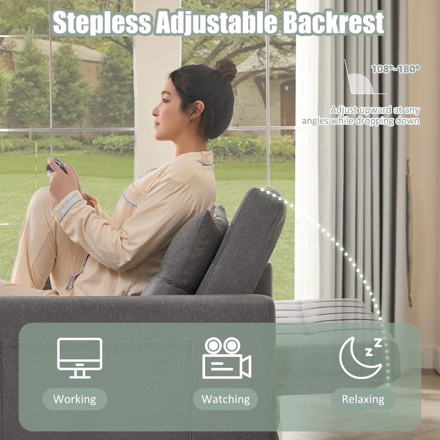 - Stepless Adjustable Backrest: Convertible chair has Stepless adjustable backrest for different users and needs. It can be adjusted very simply by pushing the backrest. That’s why this chair is fit so many scenarios well, such as living room, dorm, apartment, bedroom, office