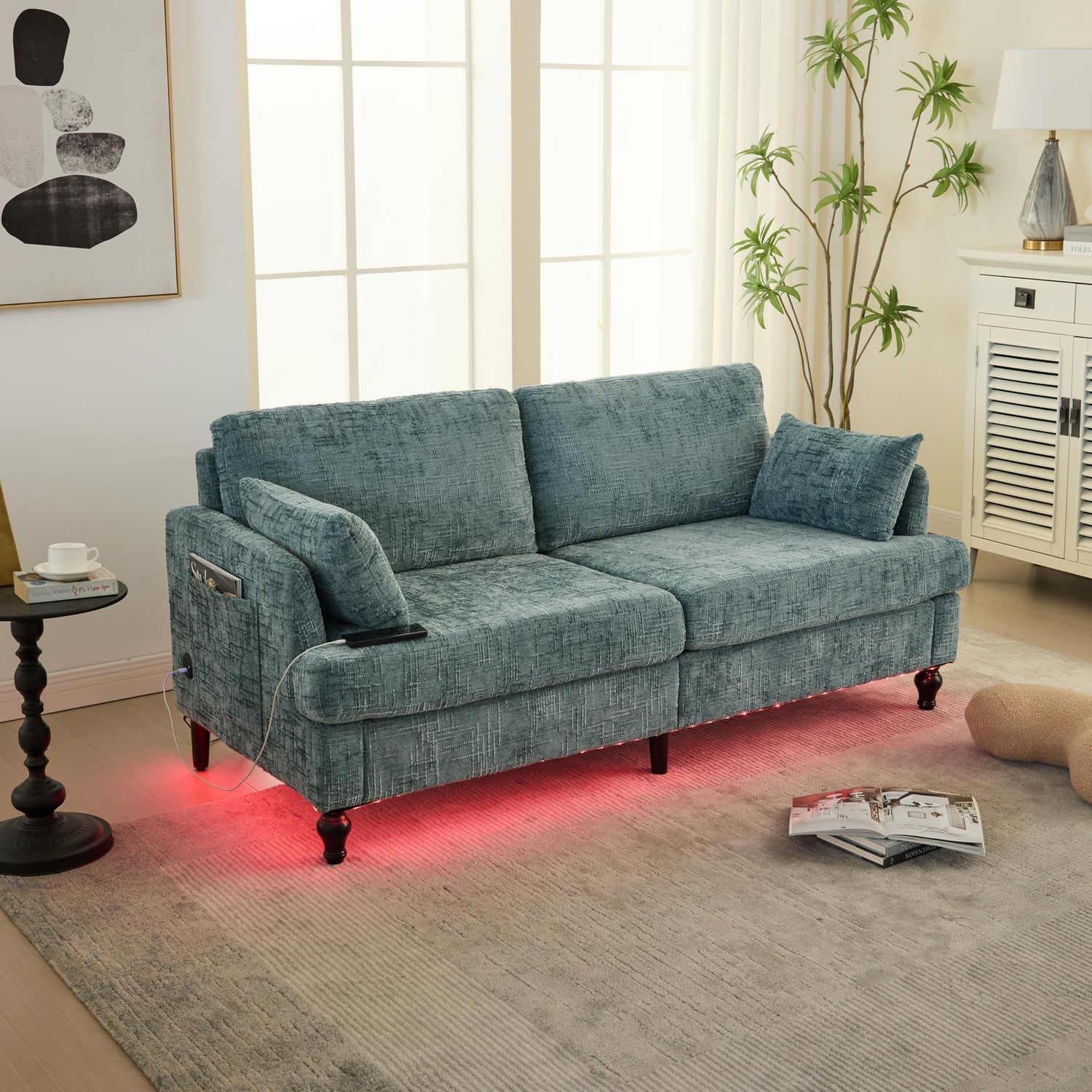 68" Oversized Chenille Sofa with LED Light, Deep Seat Loveseat with Storage, Modern Comfty Couch with USB Charging Port for Living Room, Bedroom, Apartment, Lake Blue