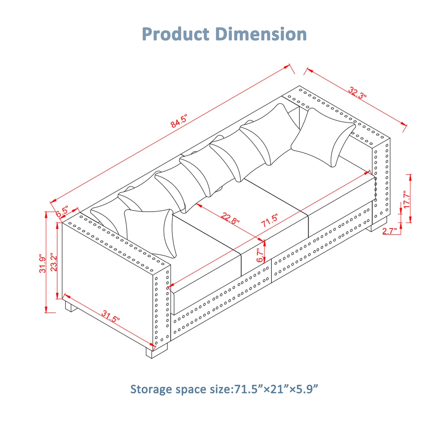84.5" Wide 3-Seater Velvet Sofa with Storage, Mid Century Modern Chesterfield Couch, Upholstered Love Seat with Deep Seat & Retro Trim Gray Velvet Couch for Living Room, Office, Apartment (Grey)
