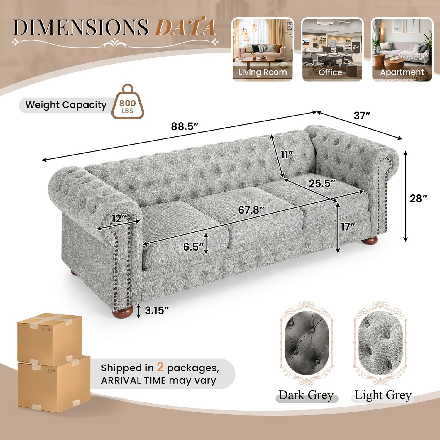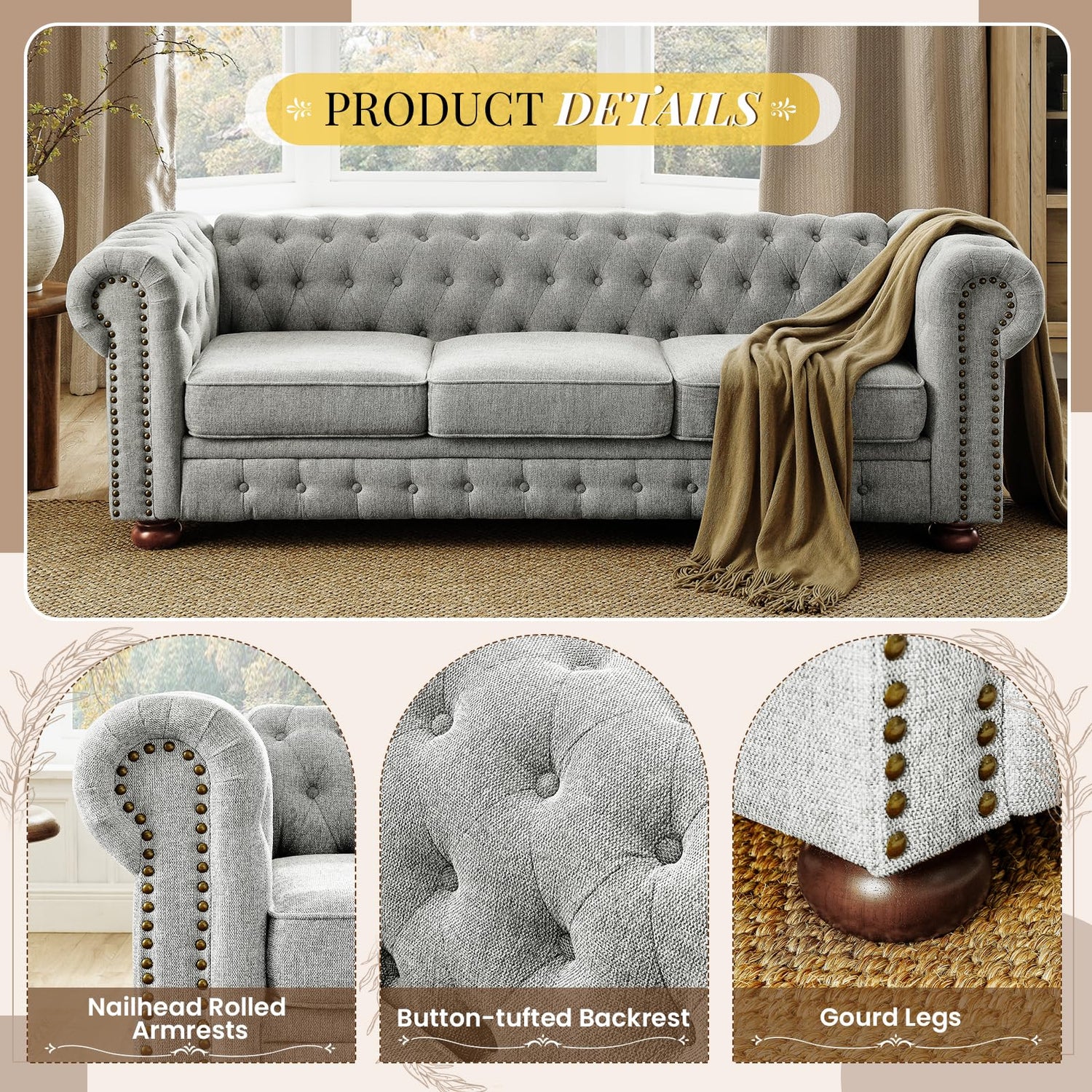 88.5''W Linen Chesterfield Sofa, Mid Century Modern Couch with Button Tufted & Rolled Armrests, Comfy 3-Seater Deep Seat Sofa with Nailhead Trim & Gourd Legs for Living Room, Apartment(Light Grey)