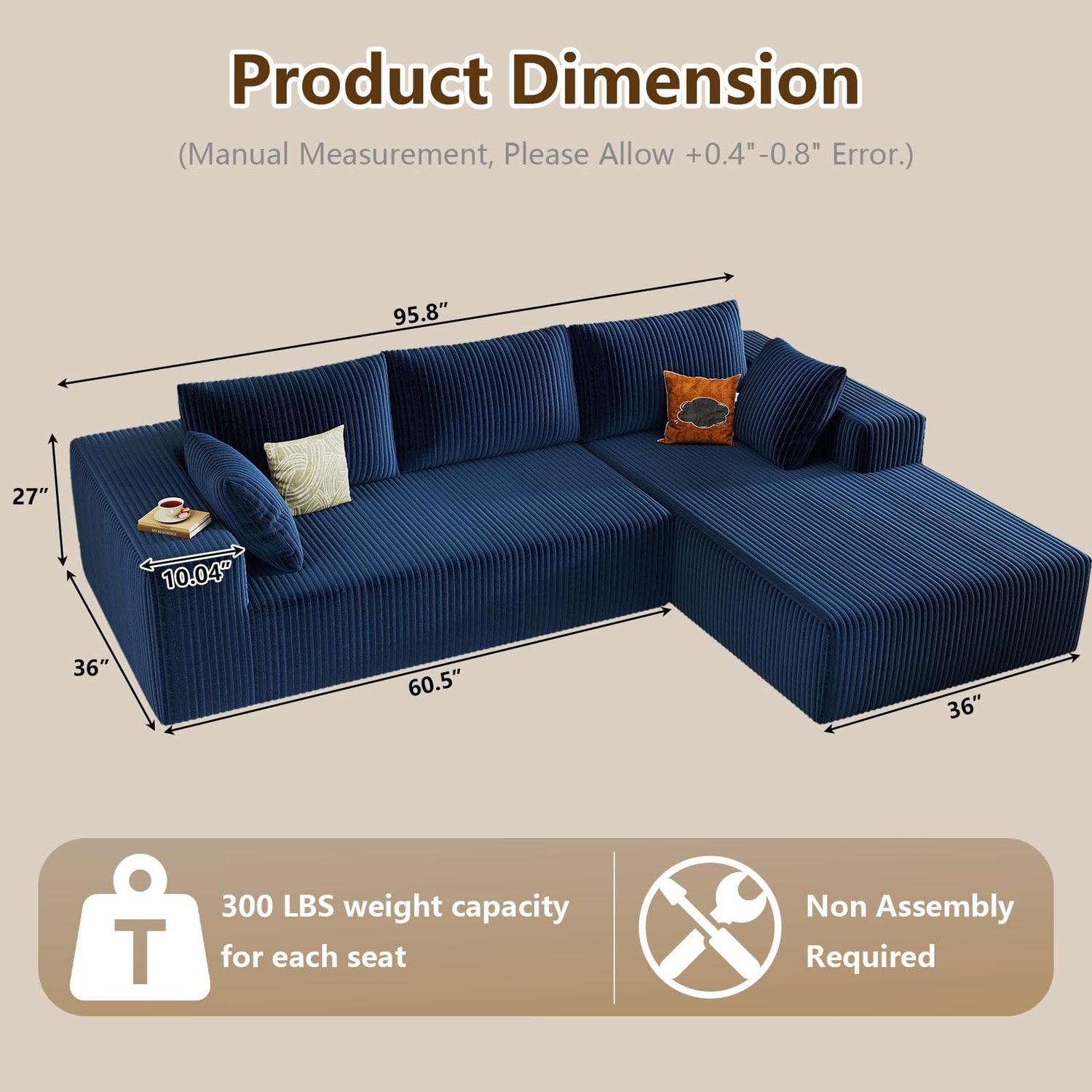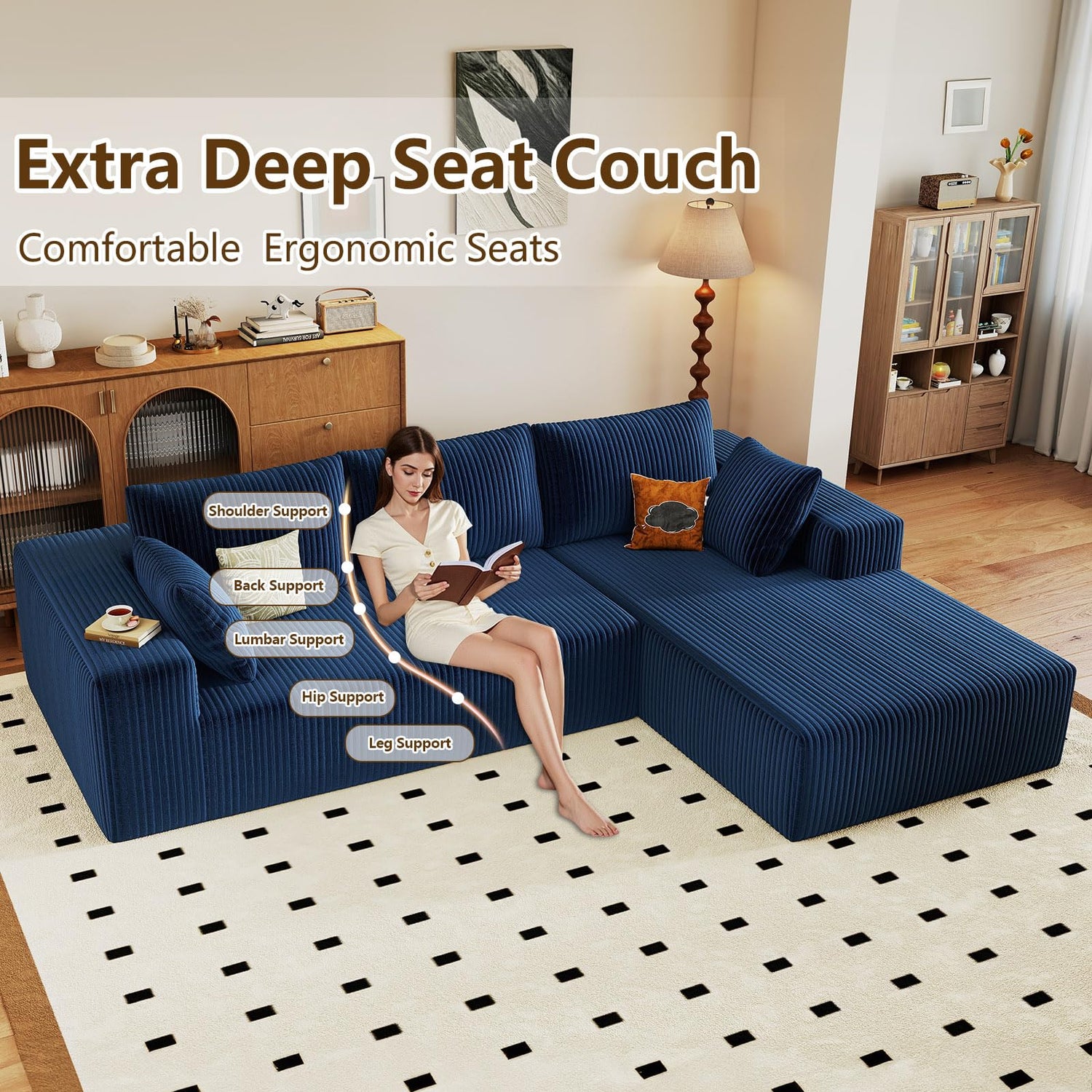 Details: 96" Modular Sectional Couch, Boneless L Shaped Cloud Sofa with Chaise Lounge, Corduroy Upholstered Couches Memory Foam Deep Seat, No Assembly Required, Ideal for Living Room(Blue, Right Facing)