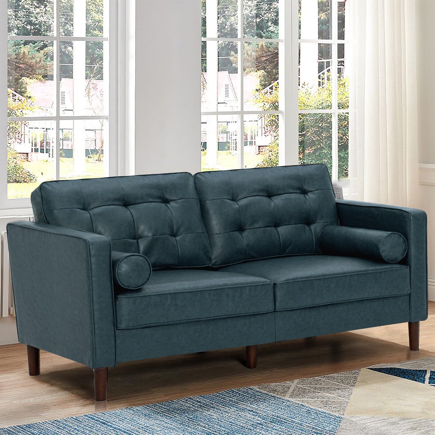 ACMEASE 67" Premium Faux Leather 2-Seater Sofa with 2 Bolster Pillows and Tufted Backrest, Mid-Century Modern Loveseat Sofa, Luxury Couch for Living Room, Bedroom, Office, Blue