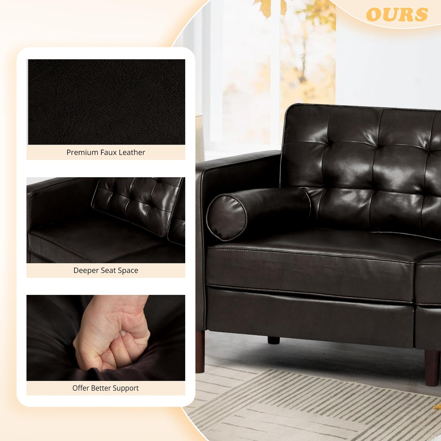 ACMEASE 67" Premium Faux Leather 2-Seater Sofa with 2 Bolster Pillows and Tufted Backrest, Mid-Century Modern Loveseat Sofa, Luxury Couch for Living Room, Bedroom, Office, Dark Brown