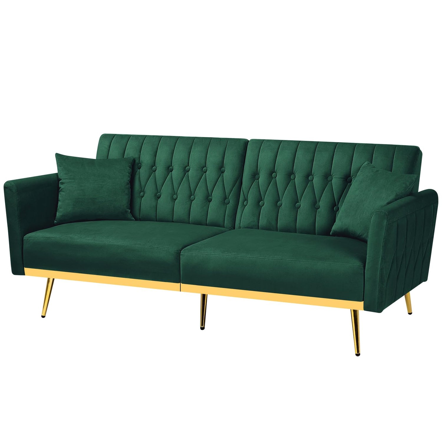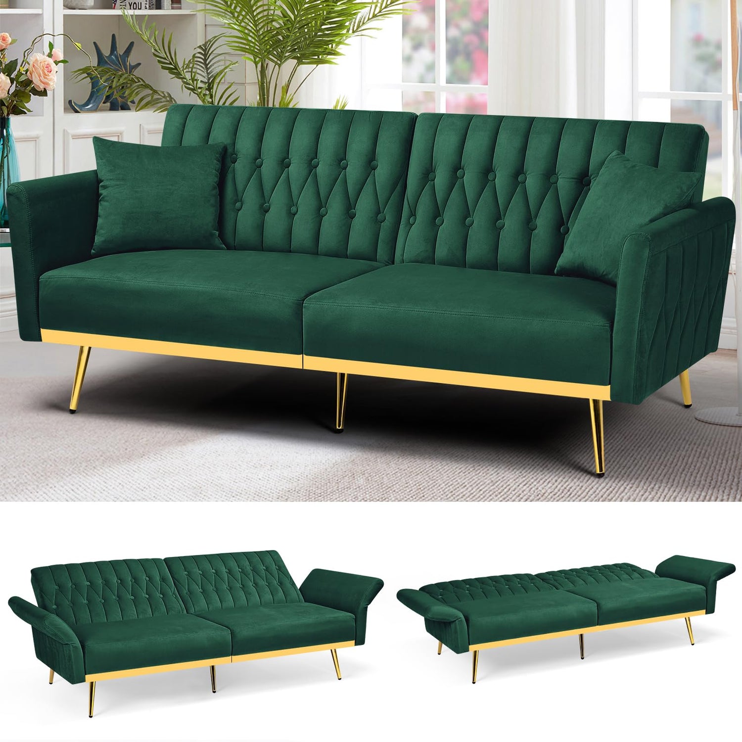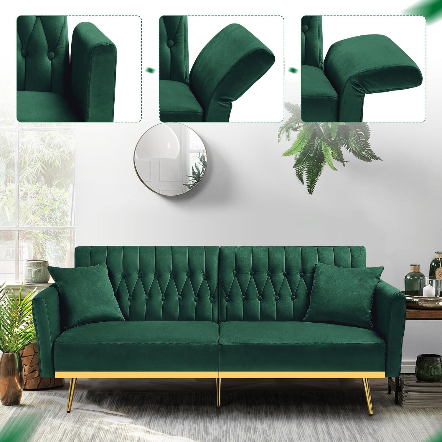 ACMEASE 70” Velvet Futon Sofa Bed w/Adjustable Backrests and Armrests, Convertible Futon Couch with 2 Pillows, Modern Tufted Sleeper Bed for Living Room, Bedroom,Green