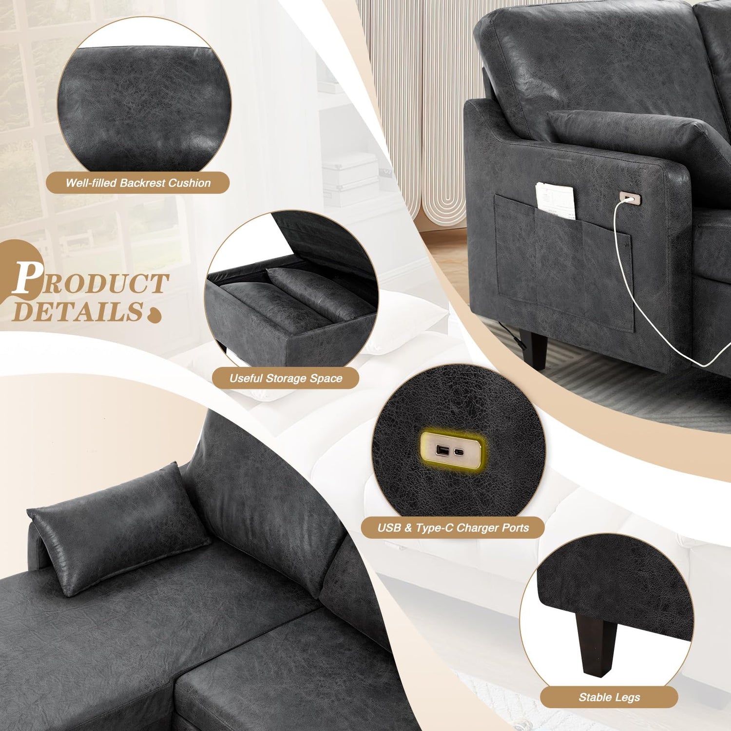 - TWO CHARGER PORTS & SIDE POCKETS: The sectional sofa have multifunctional design. Two types of charger port on armrest of L couch make you easily charge phone when sit on couch. Side storage pockets on armrests make your daily life more convenient