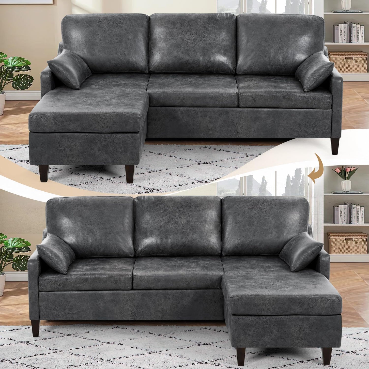 ACMEASE 76" Sectional Sofa Couch with Reversible Chaise, Suede Leather L Shaped Sofa w/USB Charger Ports & Storage Bag, Convertible Modern Couch w/Storage Space for Living Room, Small Space, Grey