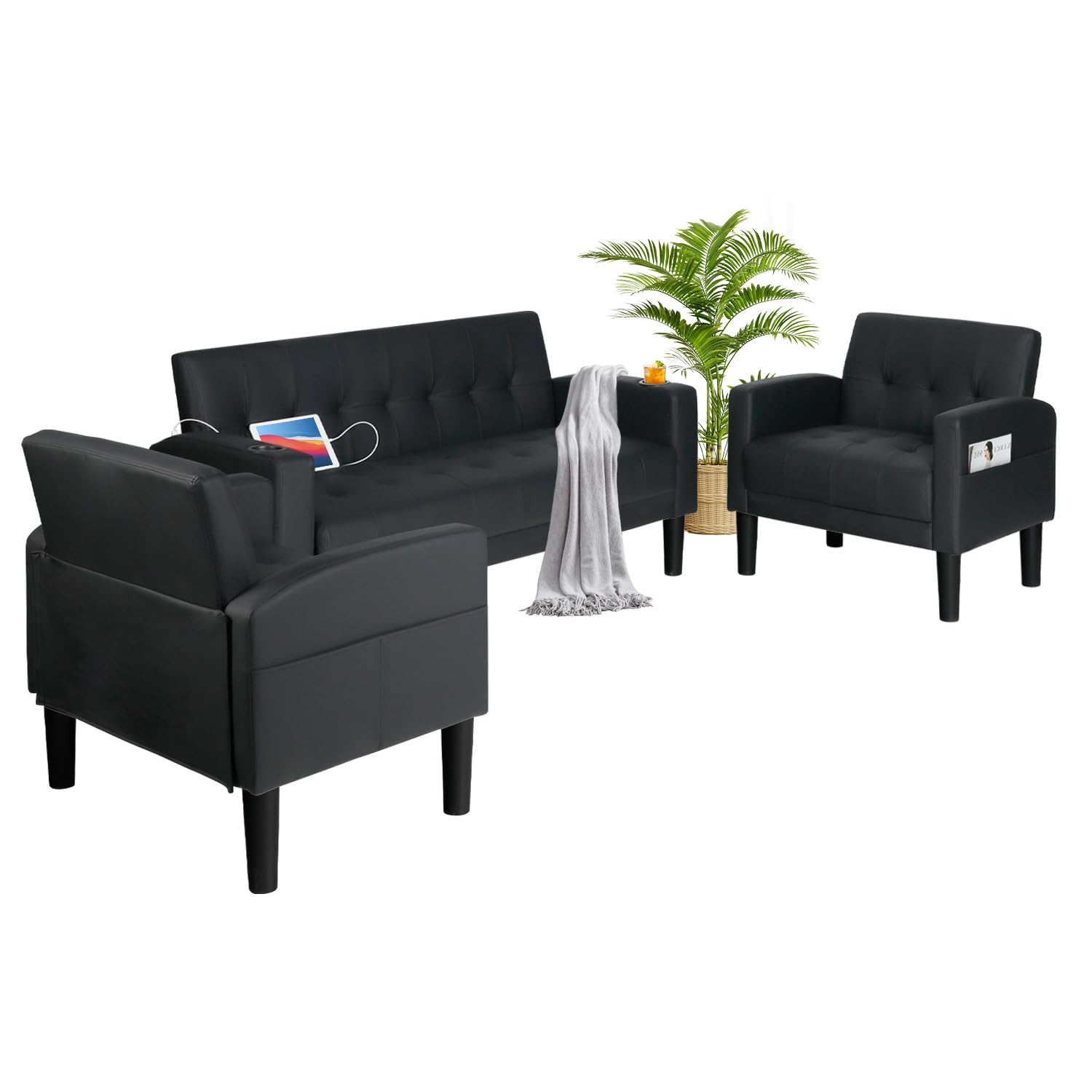 AILEEKISS 3 Piece Living Room Sofa Set Loveseat Sofas Sets with 2 USB,Cup Holders,Side Pocket, Modern Leather 3 Pcs Sectional Couches Set for Apartment, Office, Bedroom (Black, 2-Seat+1-Seat+1-Seat)