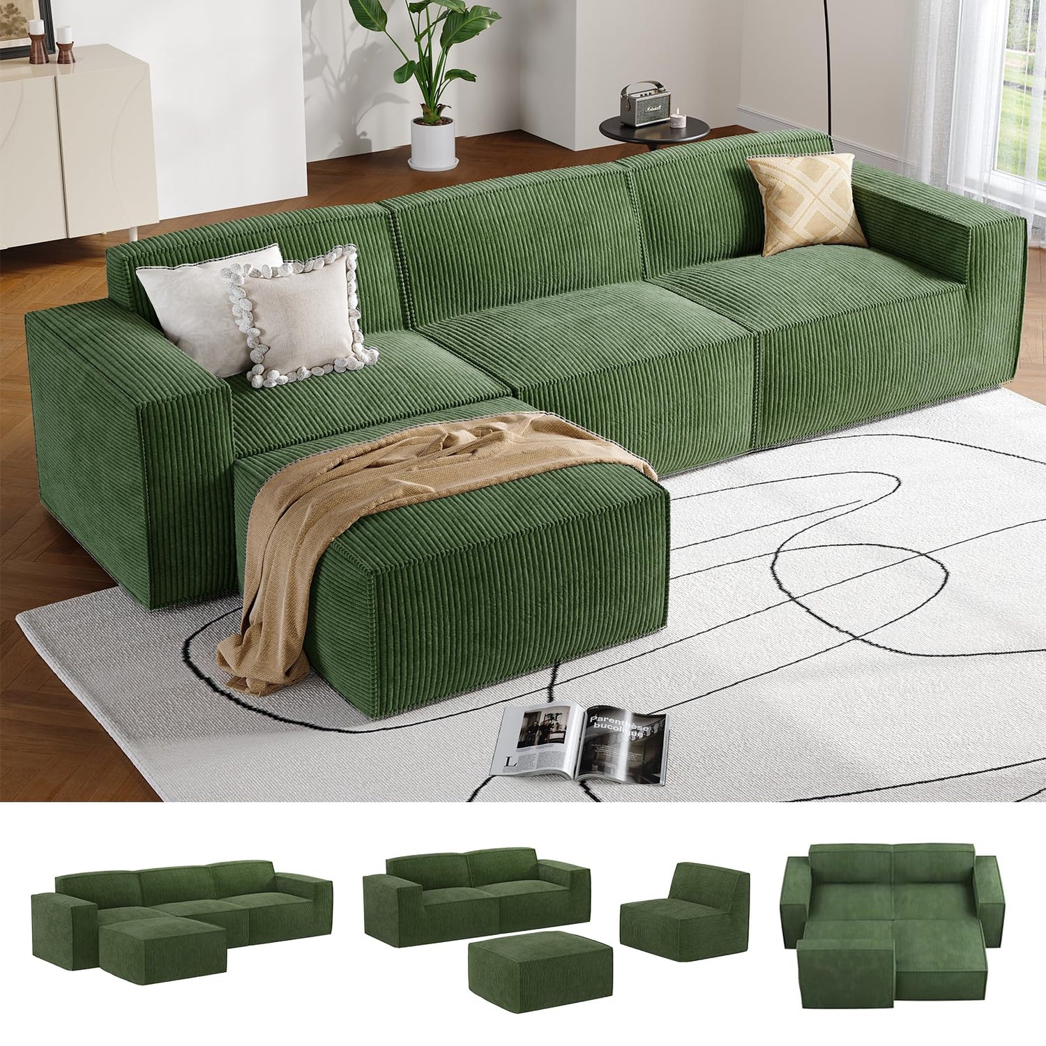 Amada 111" L Shaped Sofa Modular, Corduroy Clopud Couches with Deep Seats &High-Back, Upholstered Couches for Living Room Bedroom with Ottoman, No Assembly Required(2-Seater&1 Ottoman,Green)