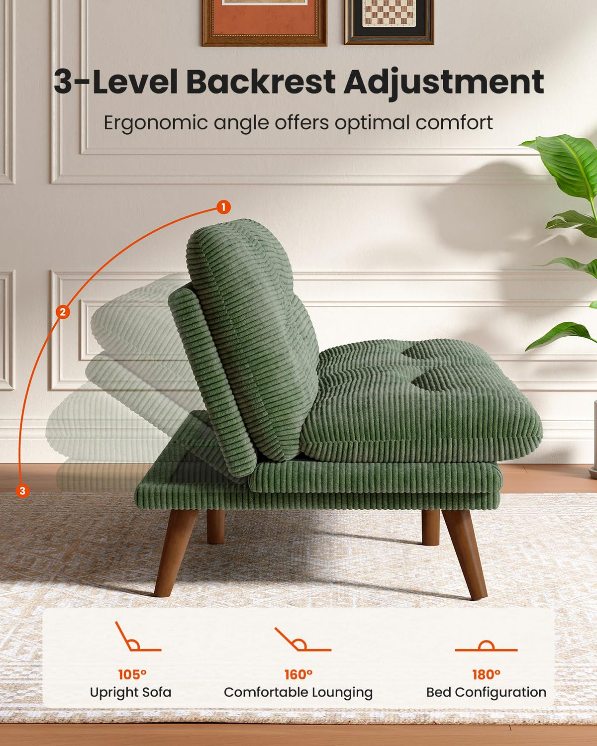 • Vintage-Inspired Corduroy Fabric: Covered in soft, durable fabric, this corduroy futon sofa bed blends comfort with vintage style. The mid-century inspired design can add a timeless, vintage touch to any living space, elevating your home décor to the next level.