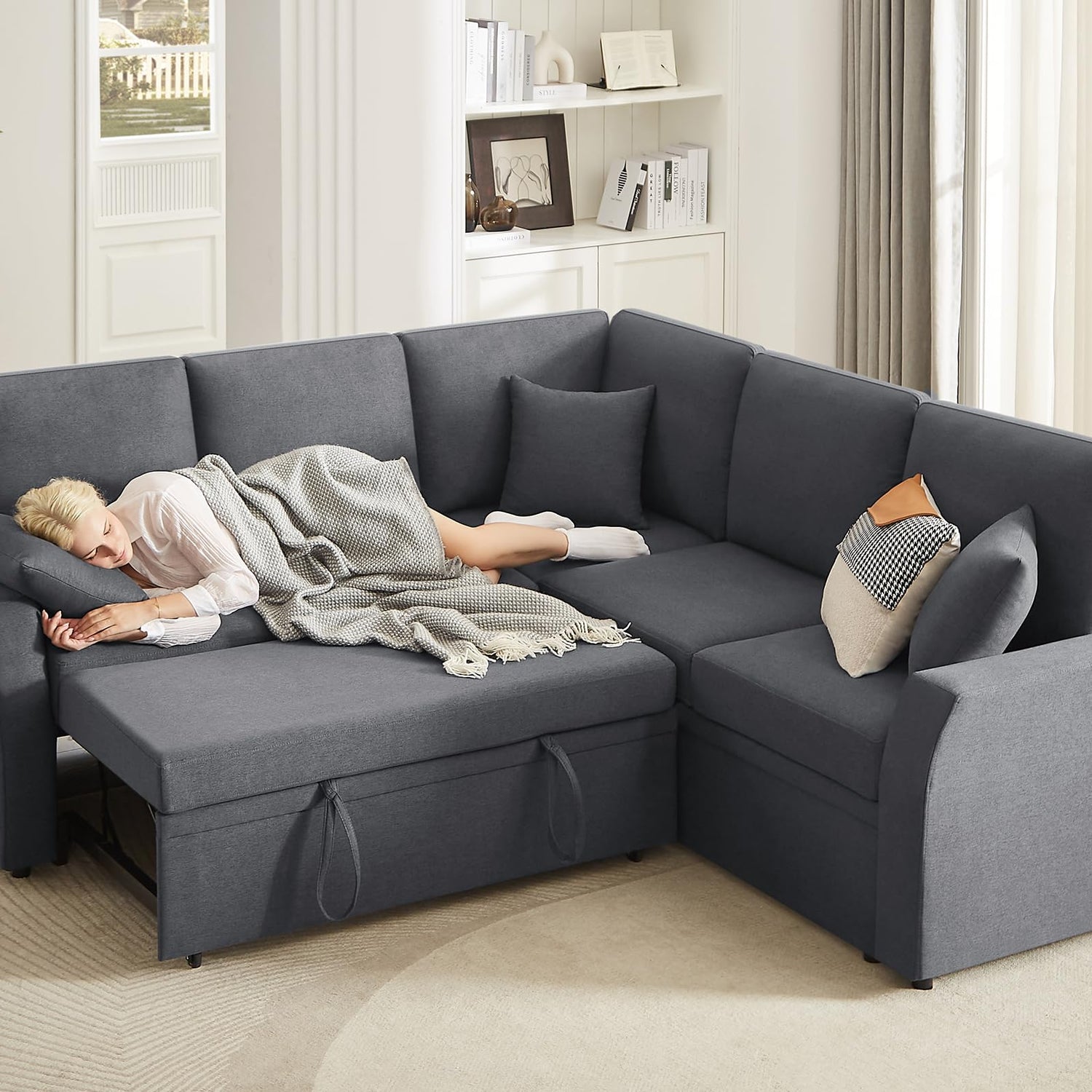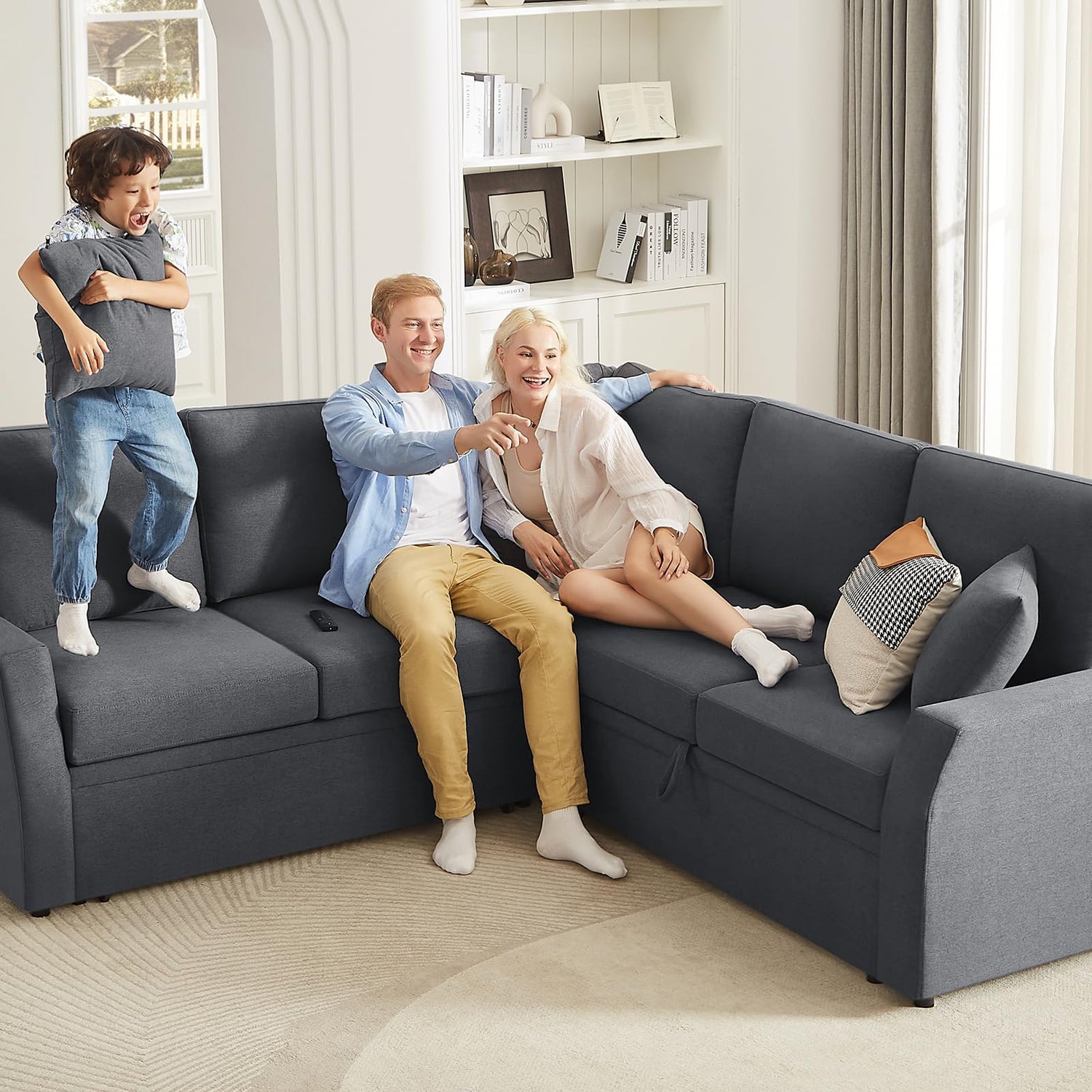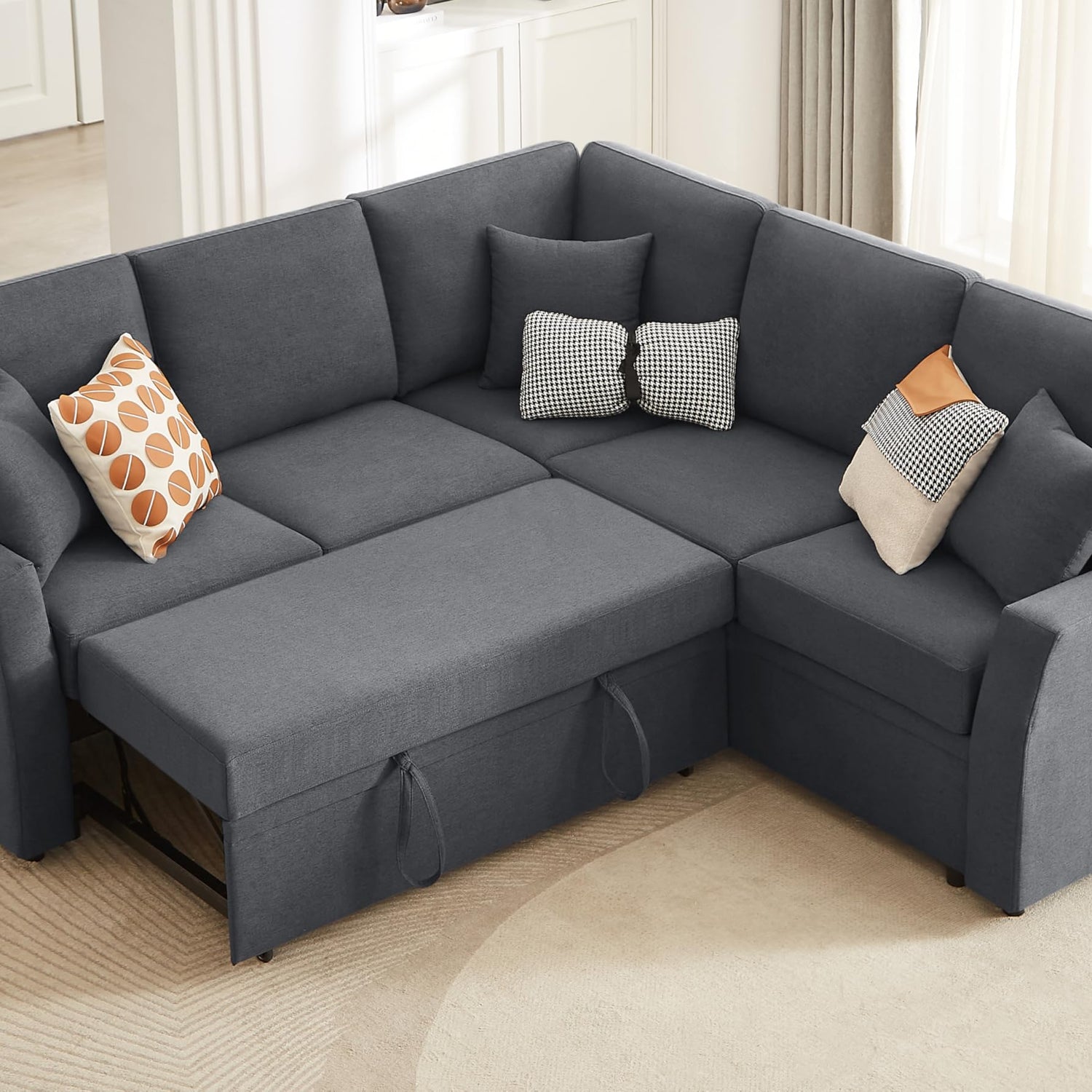 • Flexible & Space-Saving: Reversible sectional adapts to your space. Switch the storage seat and pull-out bed to fit any room layout, maximizing your living area with ease.