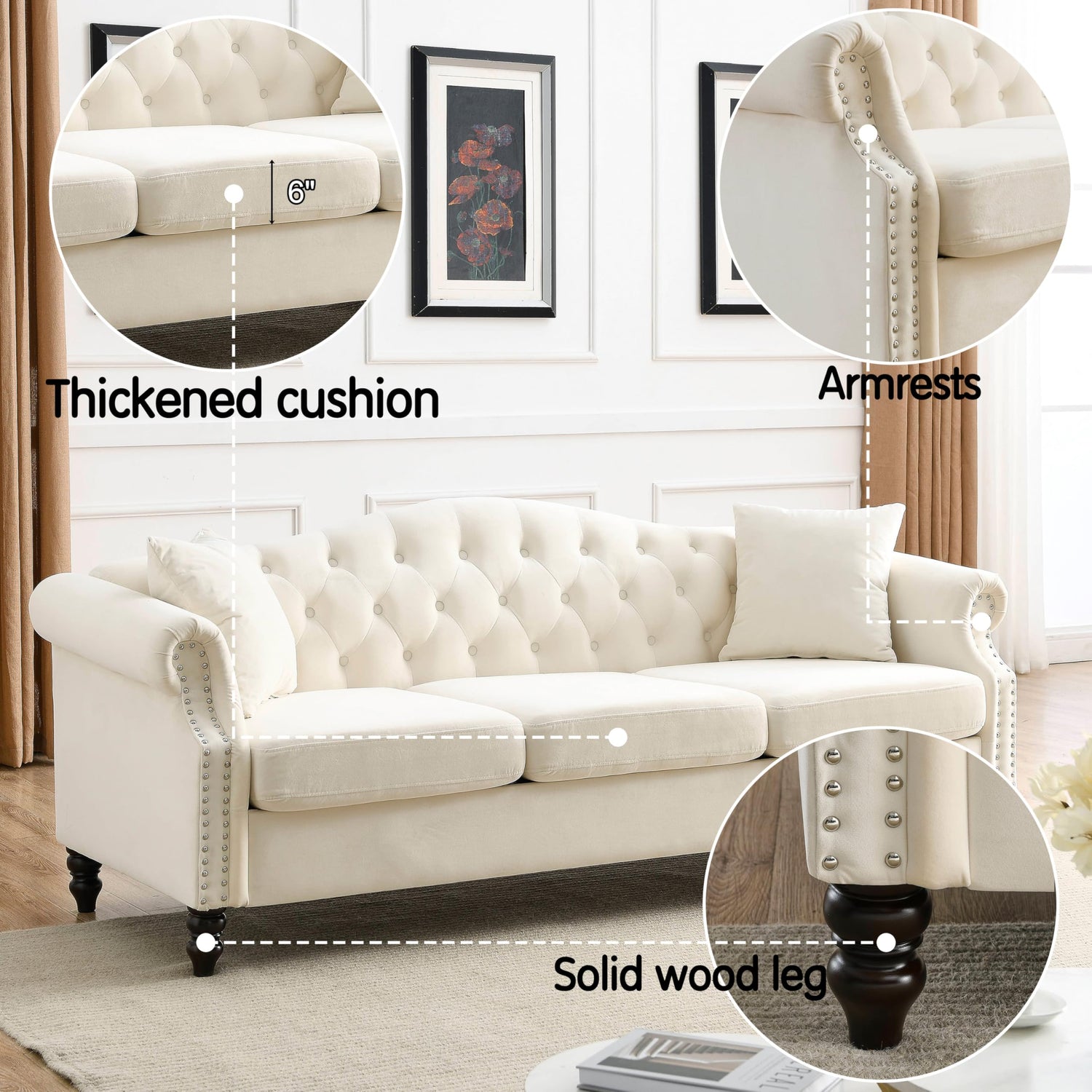 - 【Sturdy and Durable】The frame of the sofa is made of solid wood for added sturdiness and durability. With comfortable foam, soft cushions supported by a curved spring structure and tufted buttons on the back and arms, this sofa is perfect for those who want to rest after a busy day.Sofa feet are 5" long