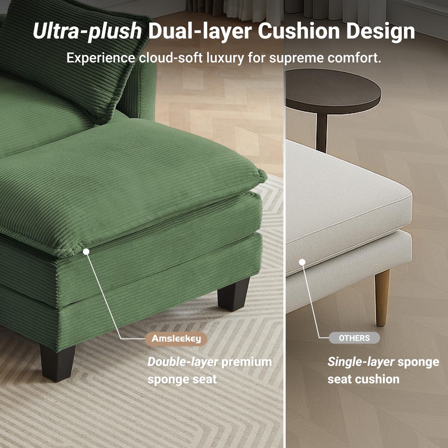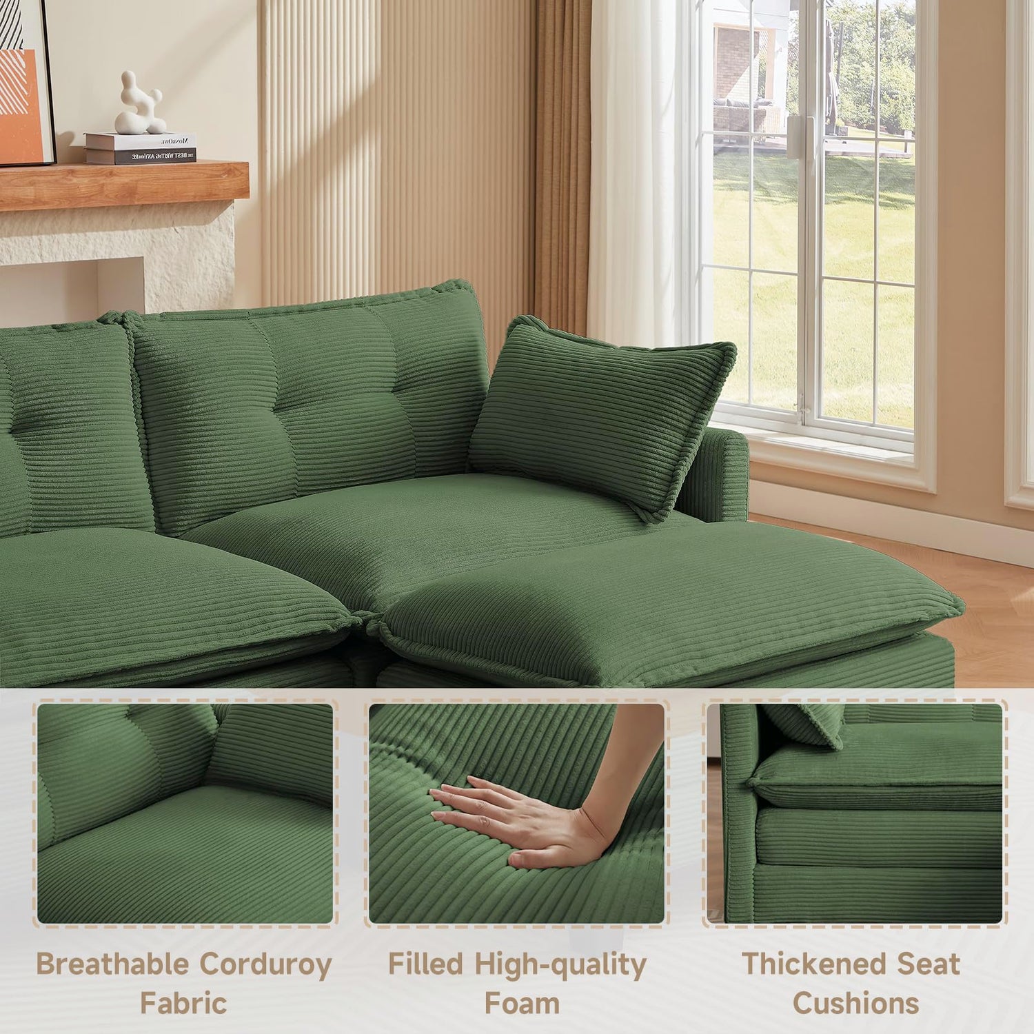 • [Super Comfy Cloud Couch]: Designed for both style and comfort, this modular sectional sofa is wrapped in luxuriously soft, breathable corduroy fabric and filled with high-density, resilient foam for a truly cloud-like feel. Whether you are watching your favorite show, or simply unwinding after a long day, this sofa offers the perfect balance of support and plush comfort. A perfect fit for living rooms, bedrooms, and home offices, its versatile, modern design blends seamlessly with any decor.