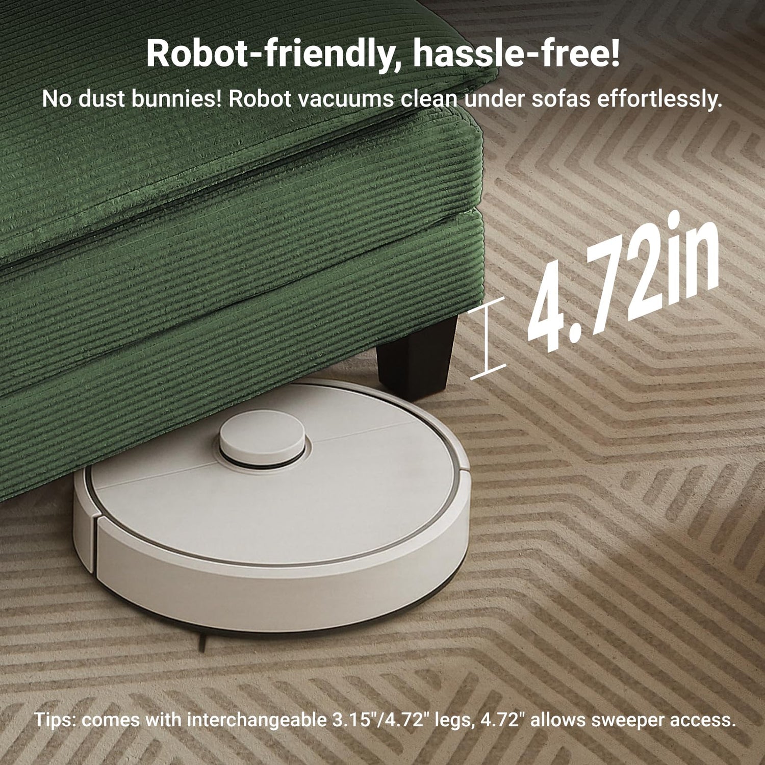 • [Two Sets of Sofa Legs]: This cloud sofa comes with two sets of interchangeable legs: a 3.15-inch (8cm) set and a 4.72-inch (12cm) set, allowing you to customize the height to fit your comfort level and needs. Whether you prefer a lower, lounge-style feel or a higher seat for easy access, this thoughtful design adapts to you. Plus, the 4.72-inch (12cm) height provides enough clearance for a robotic vacuum, making cleaning underneath effortless.
