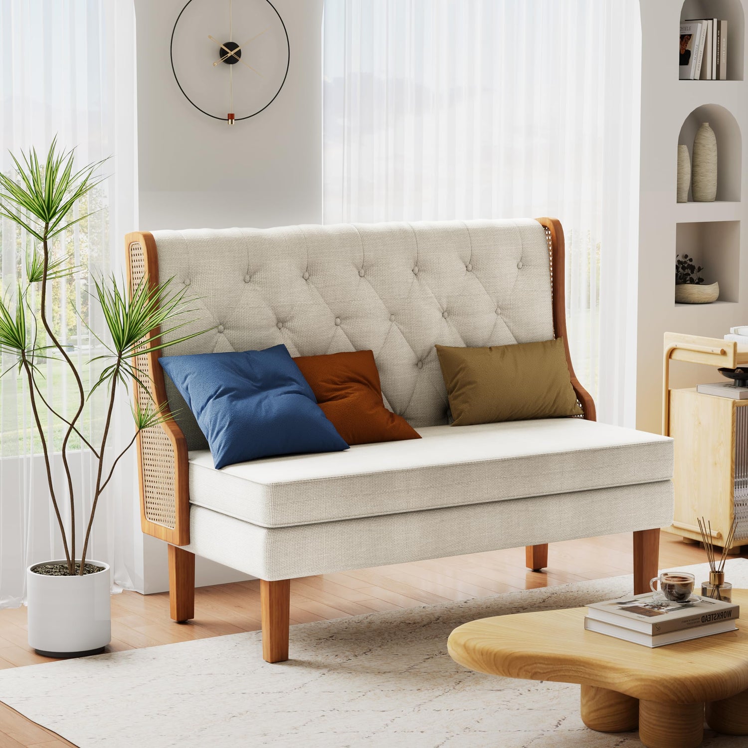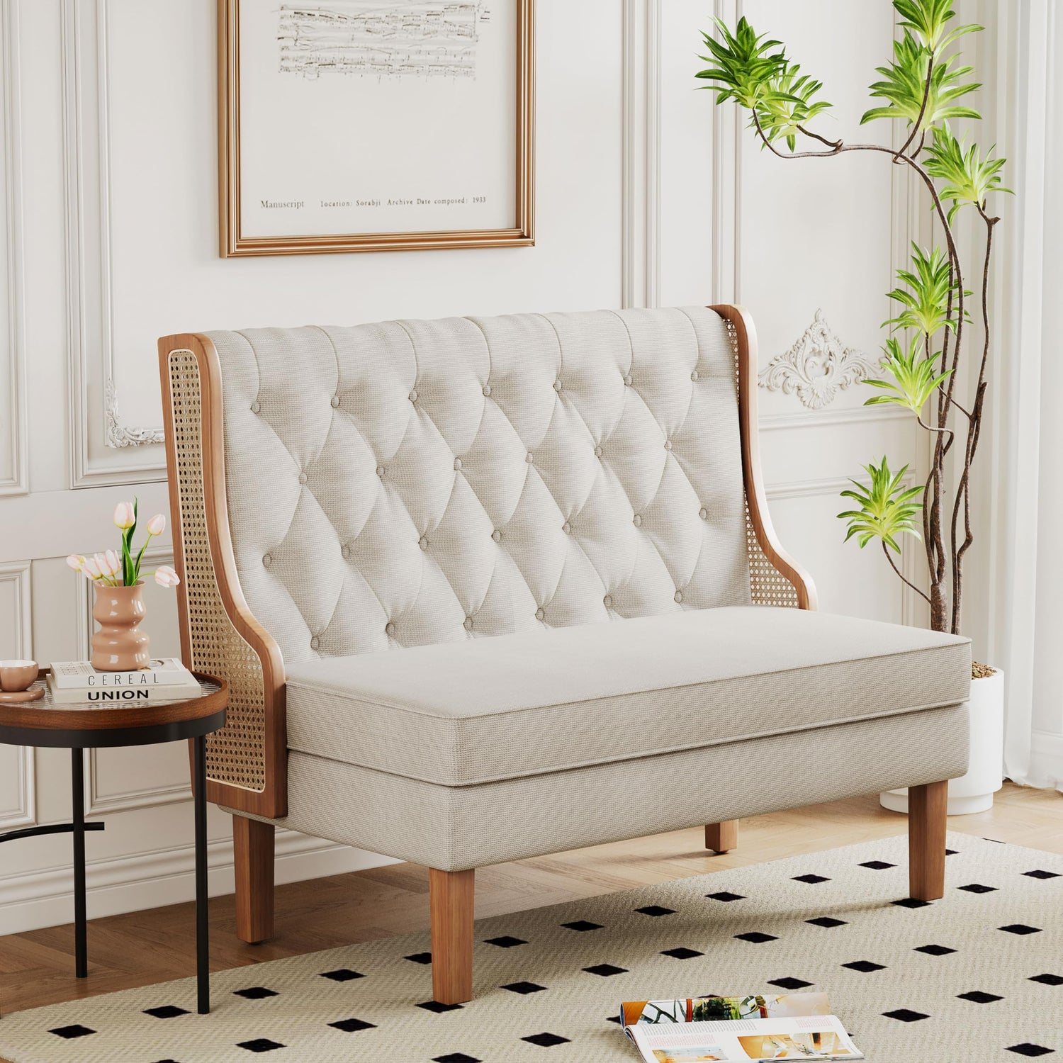 Andeworld Loveseat Settee Bench with Natural Rattan Arms,Upholstered Modern High-Back Mini Sofa Couch,Banquette Dining Bench Love Seat for Living Dining Room Bedroom Office Small Space Entryway,Beige