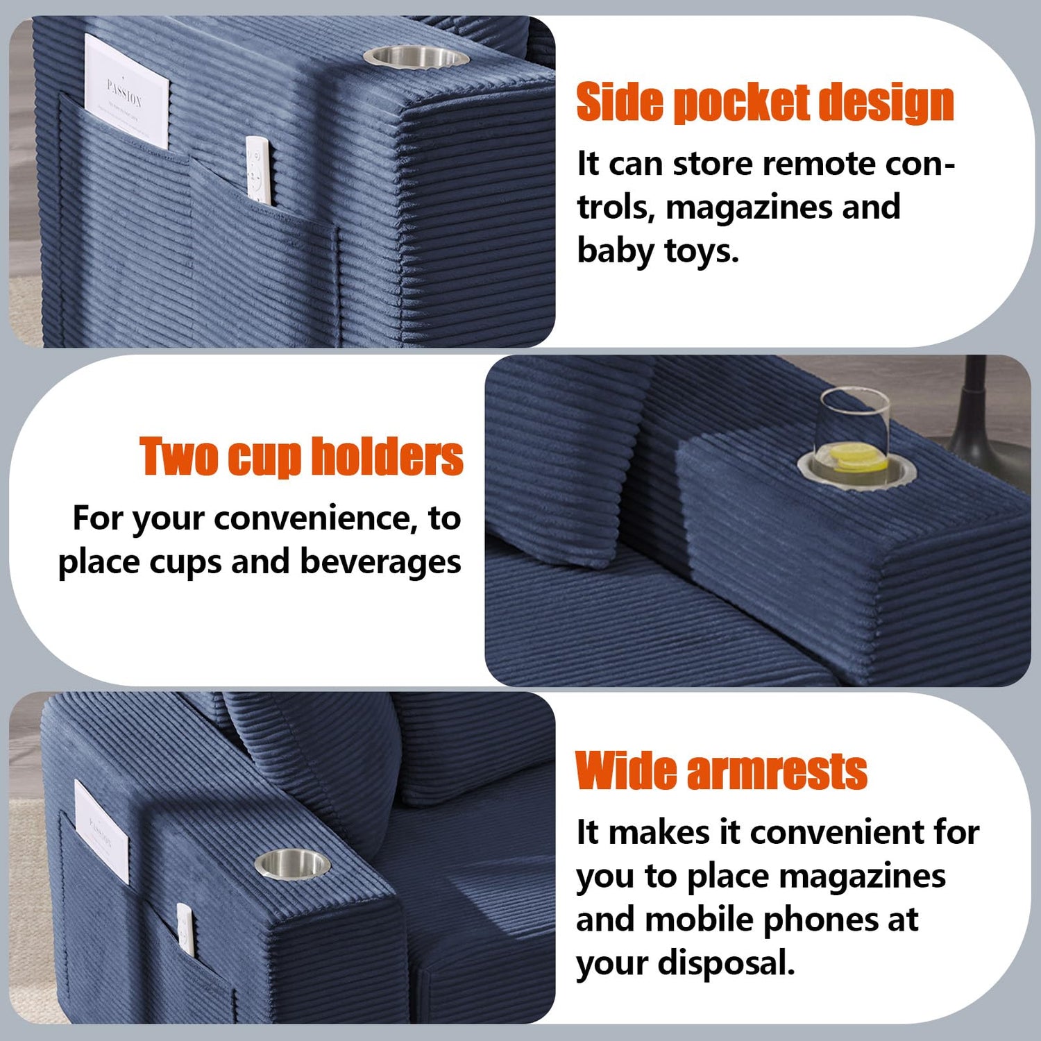 Storage Side Pockets and Cup Holder: The couch boneless includes convenient side pockets and cup holders, providing extra storage and keeping your essentials within reach.