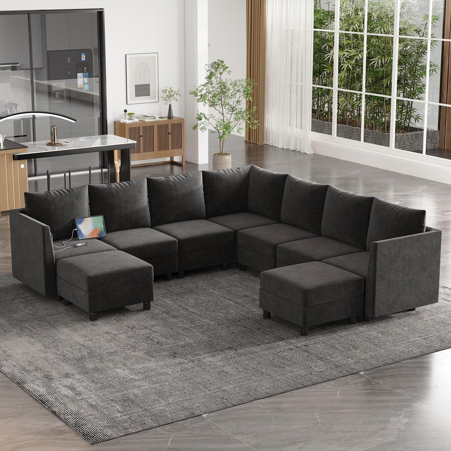 Apicizon Modular Sectional Couch, 9 Seats U Shaped Couch with Storage, Modern Chenille Sofa Set with USB Charging Ports, Comfy Couches with Chaise for Living Room, Office, Dark Grey