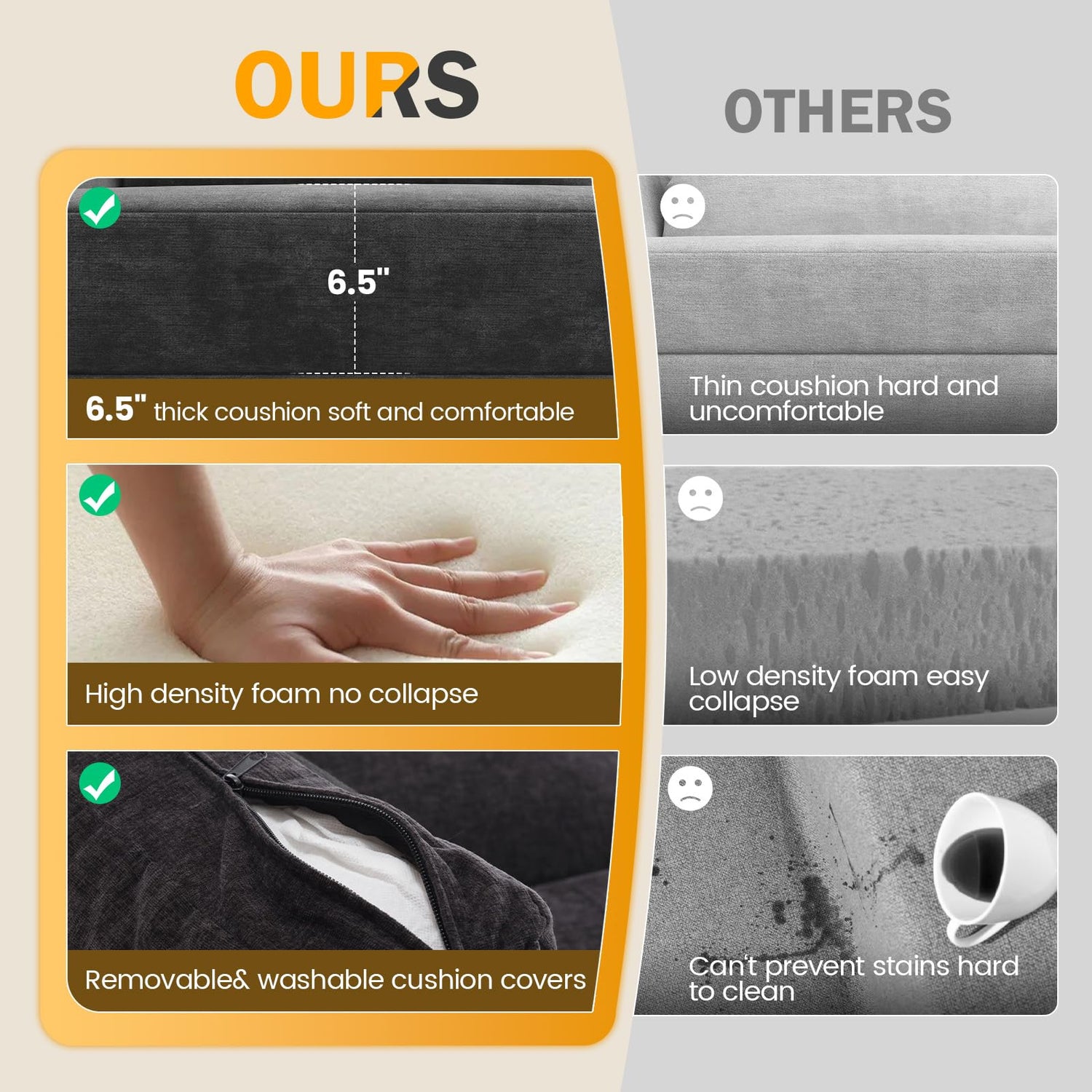 - 【SELECT PREMIUM MATERIALS】Our selection criteria for wood frame: drying 4 times, selection 30+ years old tree, 8%-12% moisture content. The cushions are filled with high density memory foam and stable steel springs. The modular sectional couch is upholstered in high quality chenille fabric, known for its softness and skin-friendly properties.
