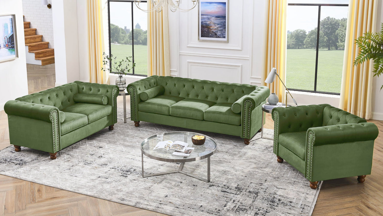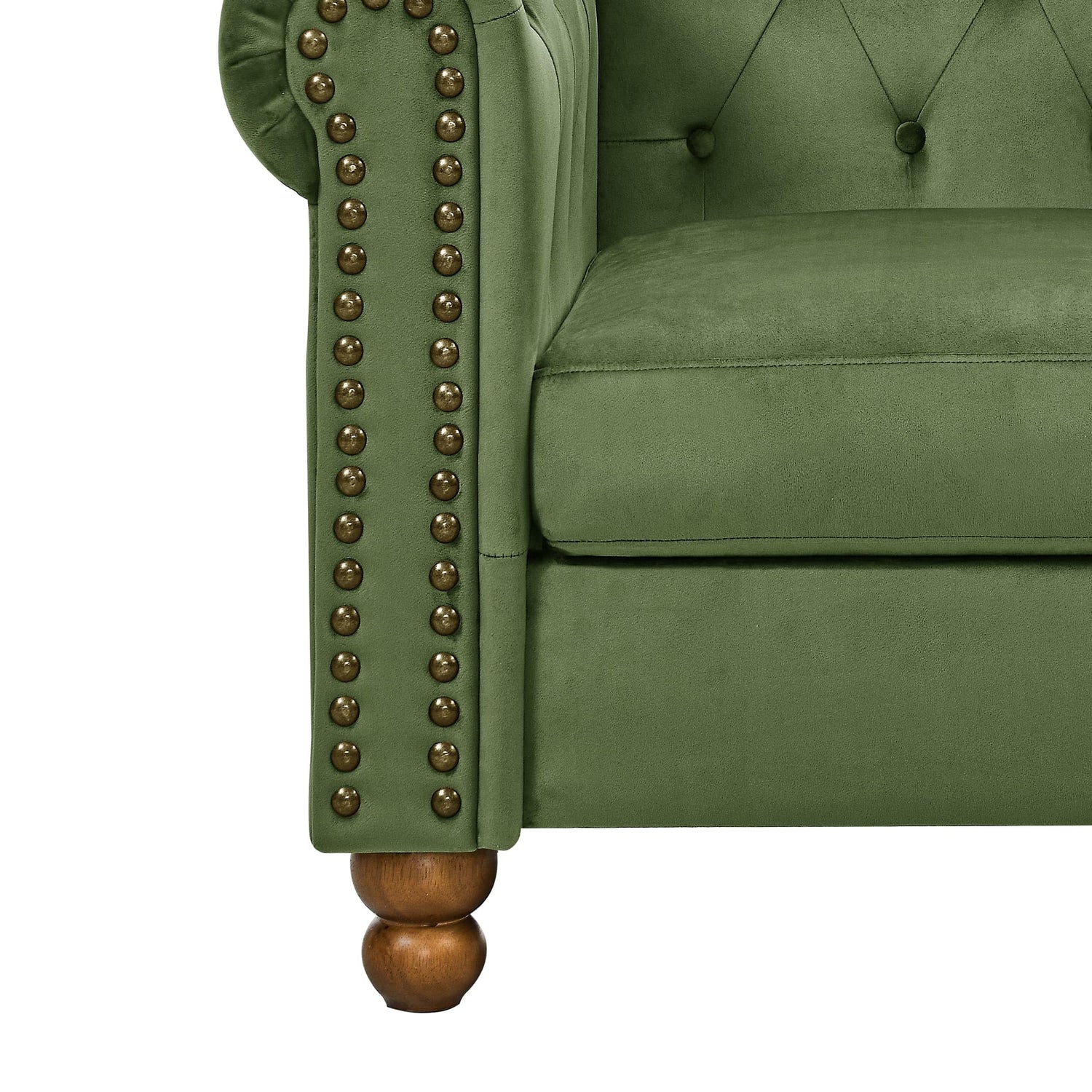 - Opulently Tailored: Adorned with Chesterfield-style features such as plush button tufting, elegant scrolled arms, sophisticated turned legs, and distinctive nailhead trim, this sofa exudes a timeless and upscale charm.