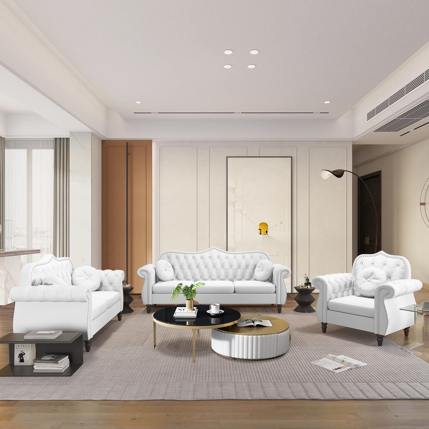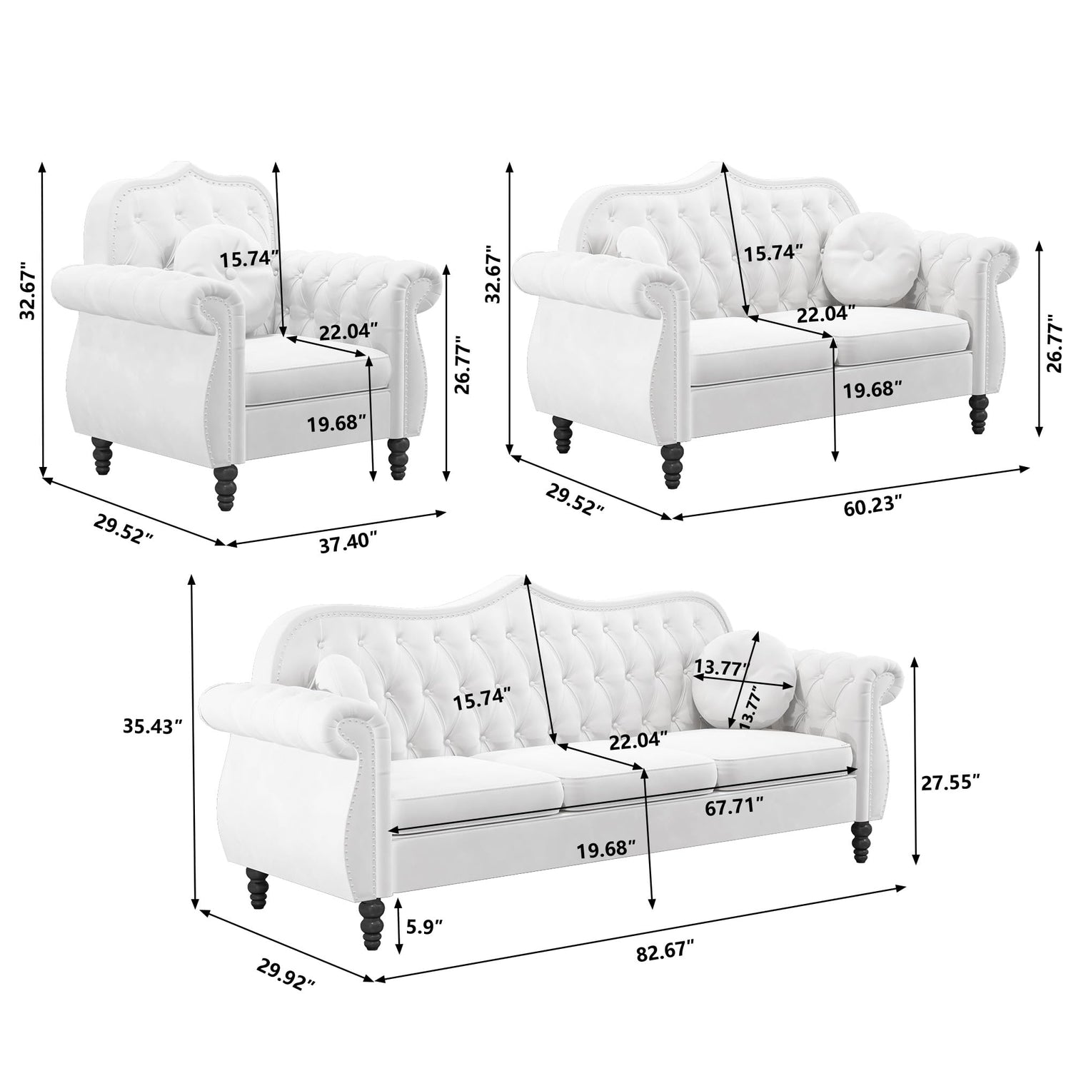 AVZEAR 3-Piece Living Room Sectional Sofa Set, Mid-Century Modern Chesterfield Upholstered Velvet Sofa Couch, Classic Tufted Button White Couch with Nailhead Trim for Living Room, Office (White)