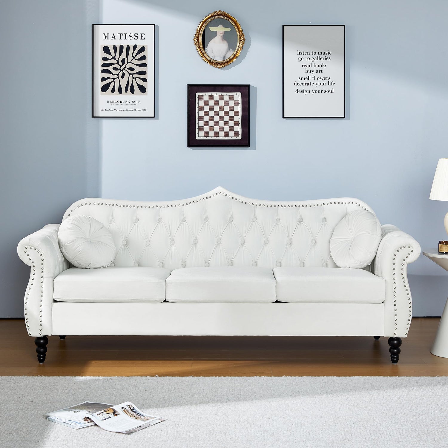 AVZEAR 82" Three Seater Sofa, Chesterfield Sofa, Mid-Century Modern Velvet Upholstered Sofa, Deep Button Tufted Living Room Sofa with Two Throw Pillows, White