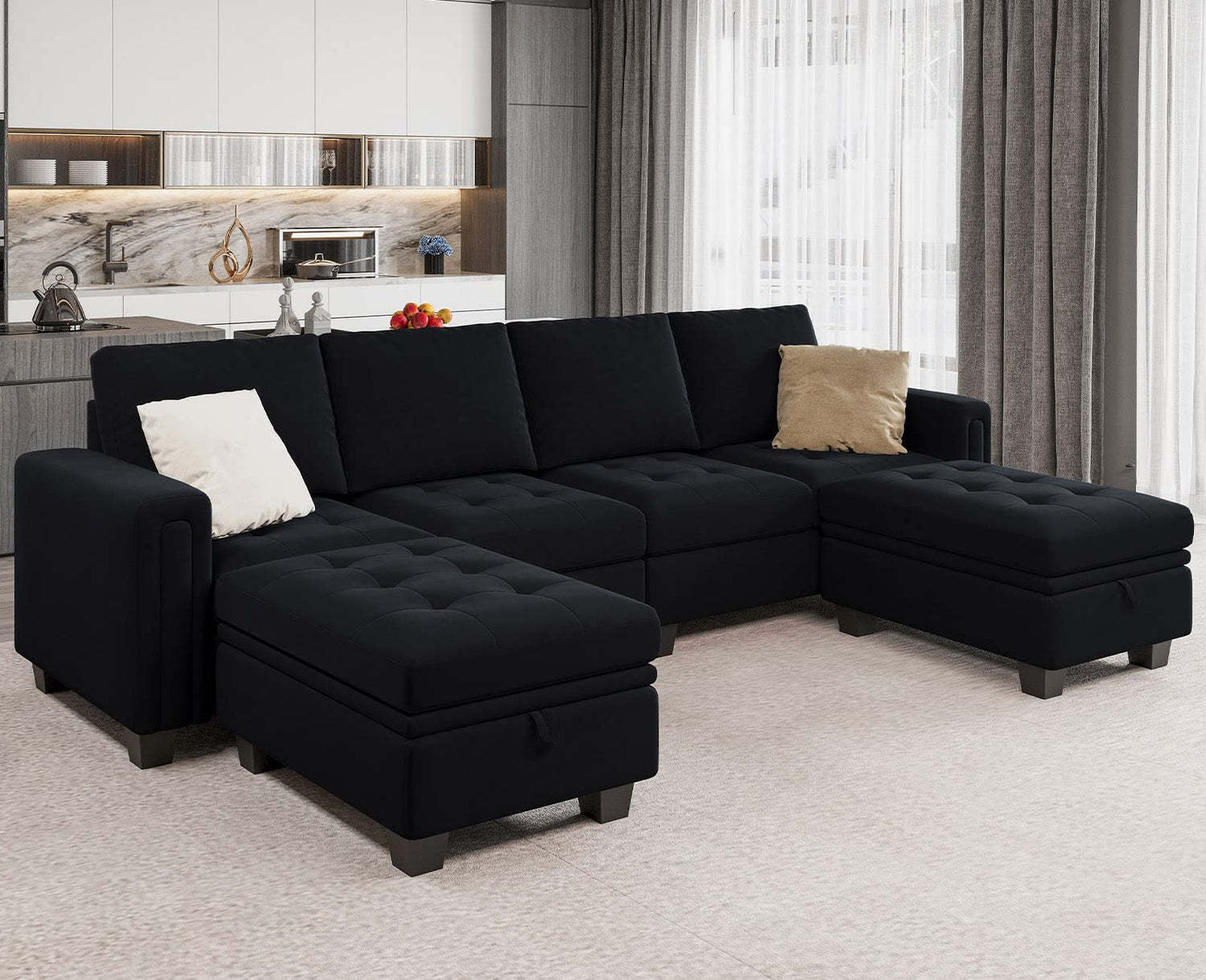Belffin Velvet U Shaped Sectional Sofa Couch with Storage Ottoman Convertibel Sectional Sofa with Reversible Chaises Black