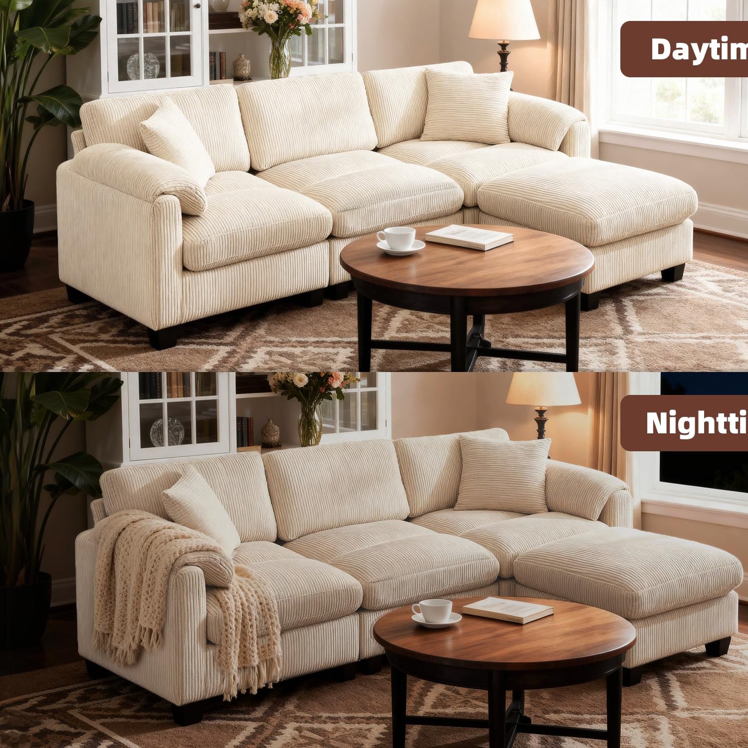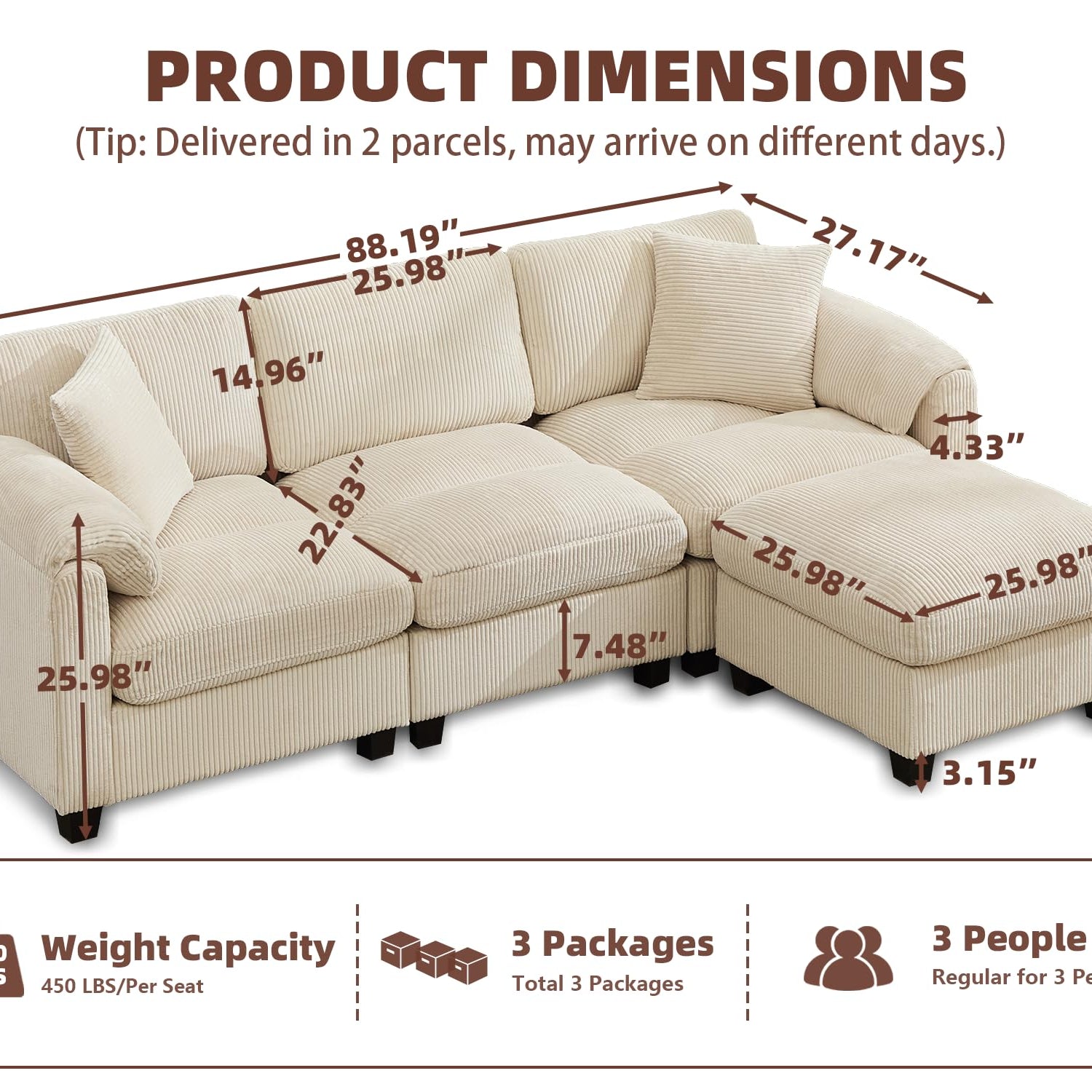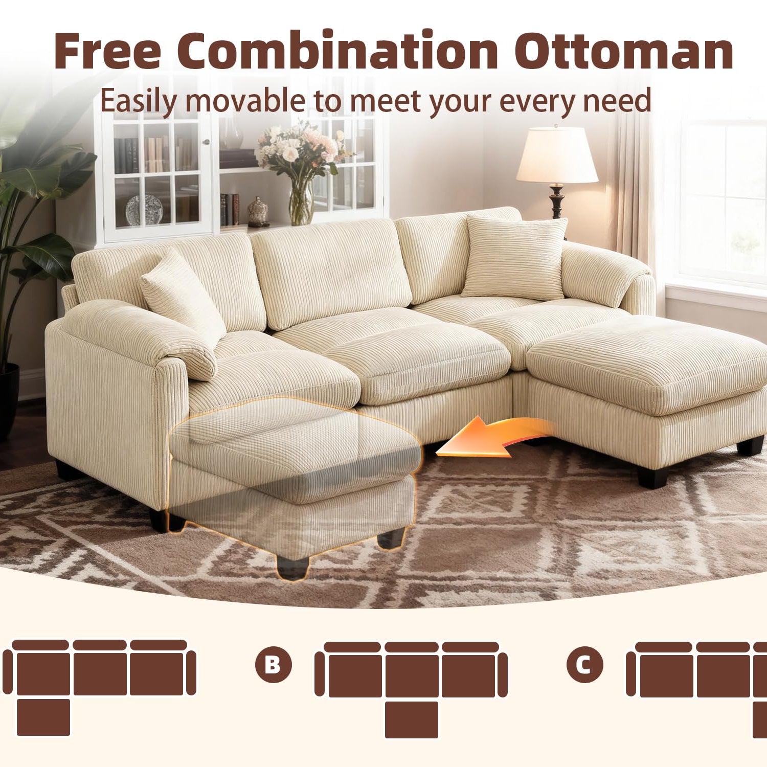 Details: Create your own comfort zone with the BINGTOO L-Shaped Modular Sectional Sofa — where cozy design meets everyday practicality.Wrapped in soft, breathable corduroy fabric, this 3-seater sofa with a movable ottoman brings a warm, modern aesthetic to your home.Enjoy deep, cloud-like cushions filled with high-resilience foam that support your body while providing exceptional comfort.