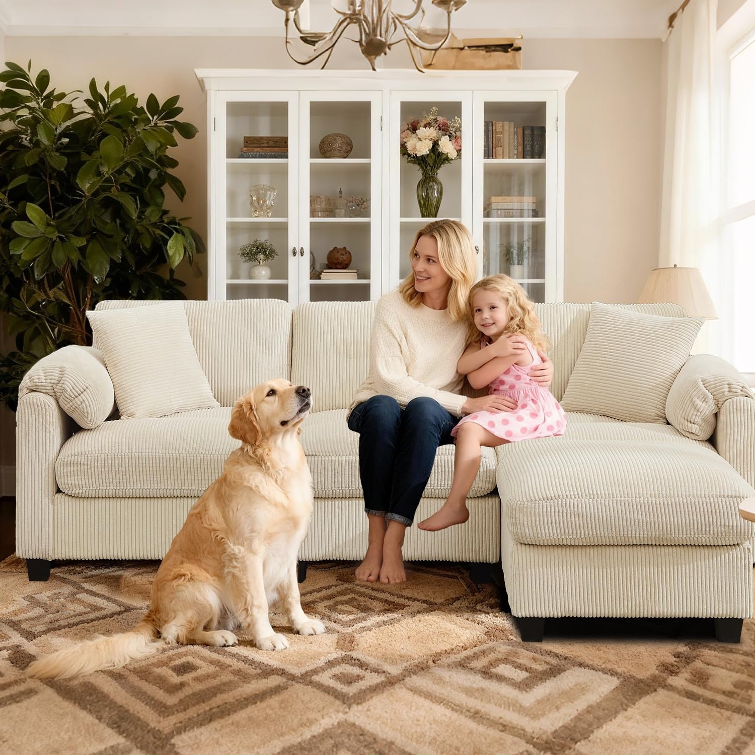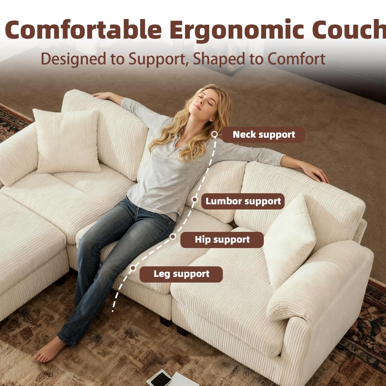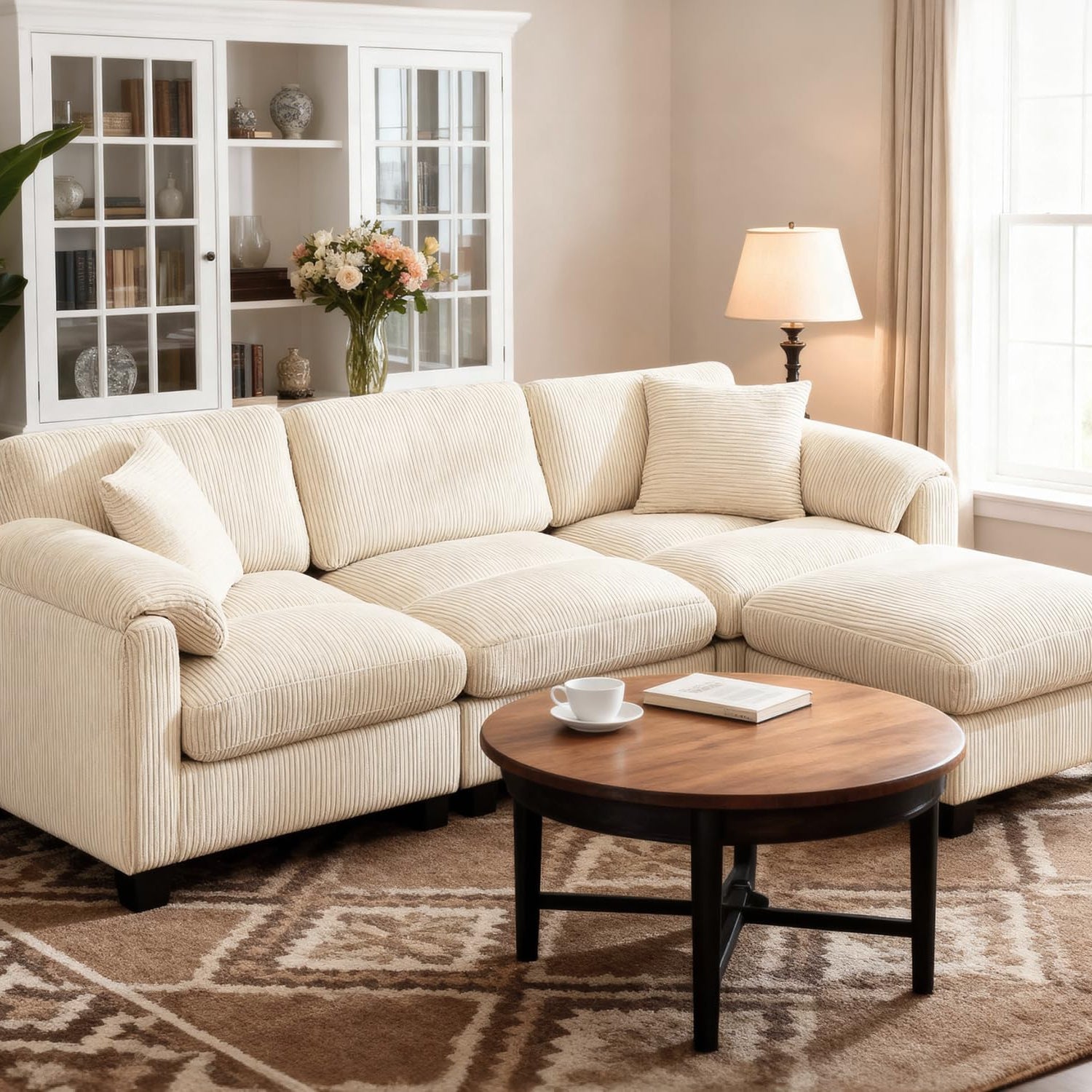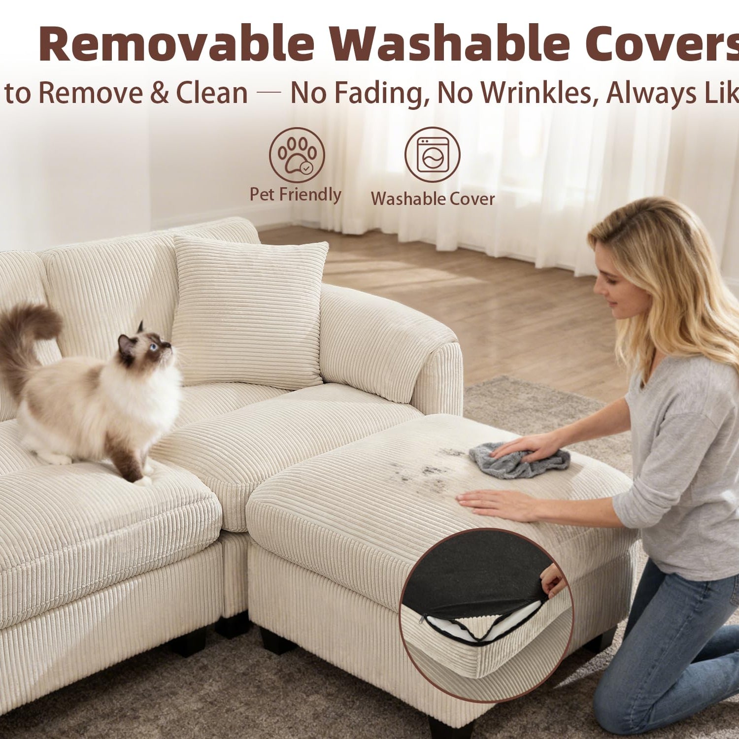 Details: Create your own comfort zone with the BINGTOO L-Shaped Modular Sectional Sofa — where cozy design meets everyday practicality.Wrapped in soft, breathable corduroy fabric, this 3-seater sofa with a movable ottoman brings a warm, modern aesthetic to your home.Enjoy deep, cloud-like cushions filled with high-resilience foam that support your body while providing exceptional comfort.