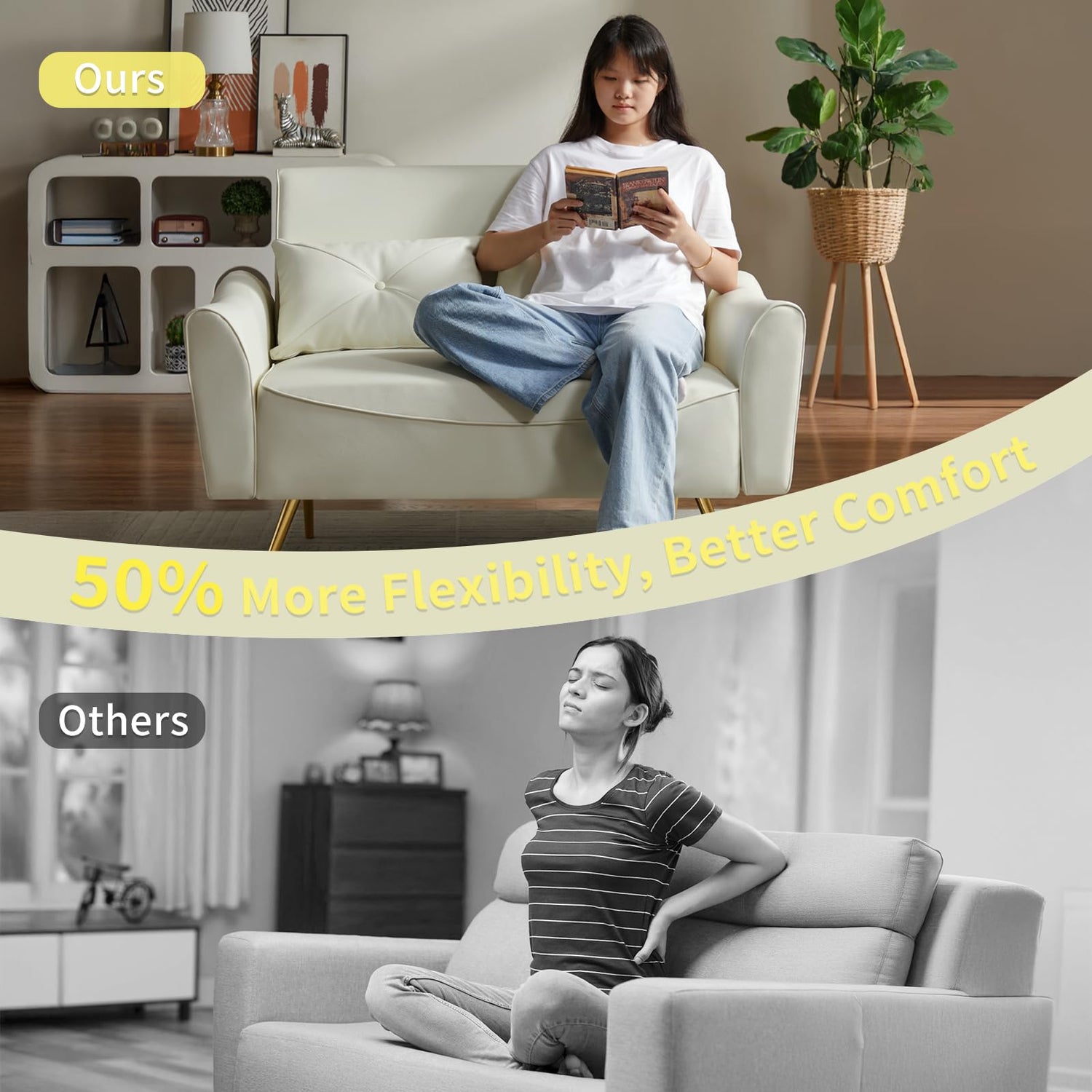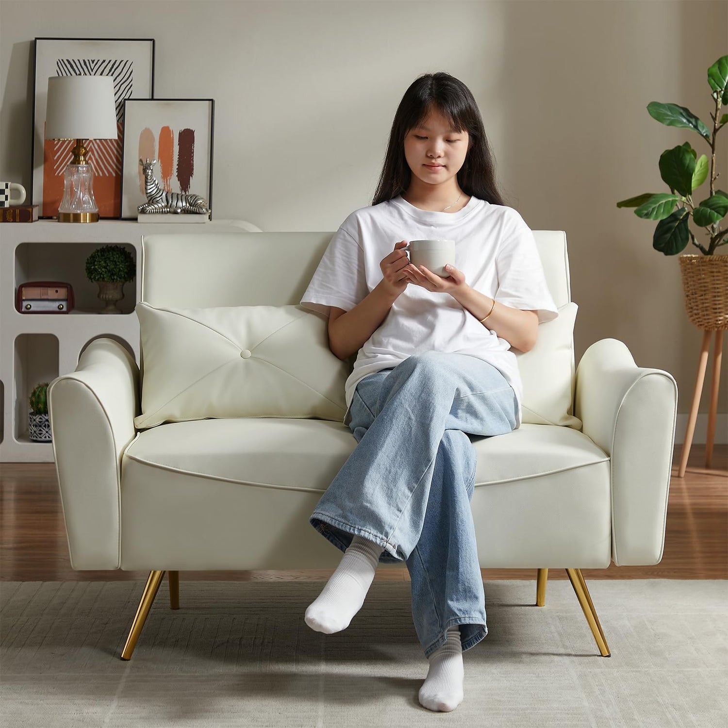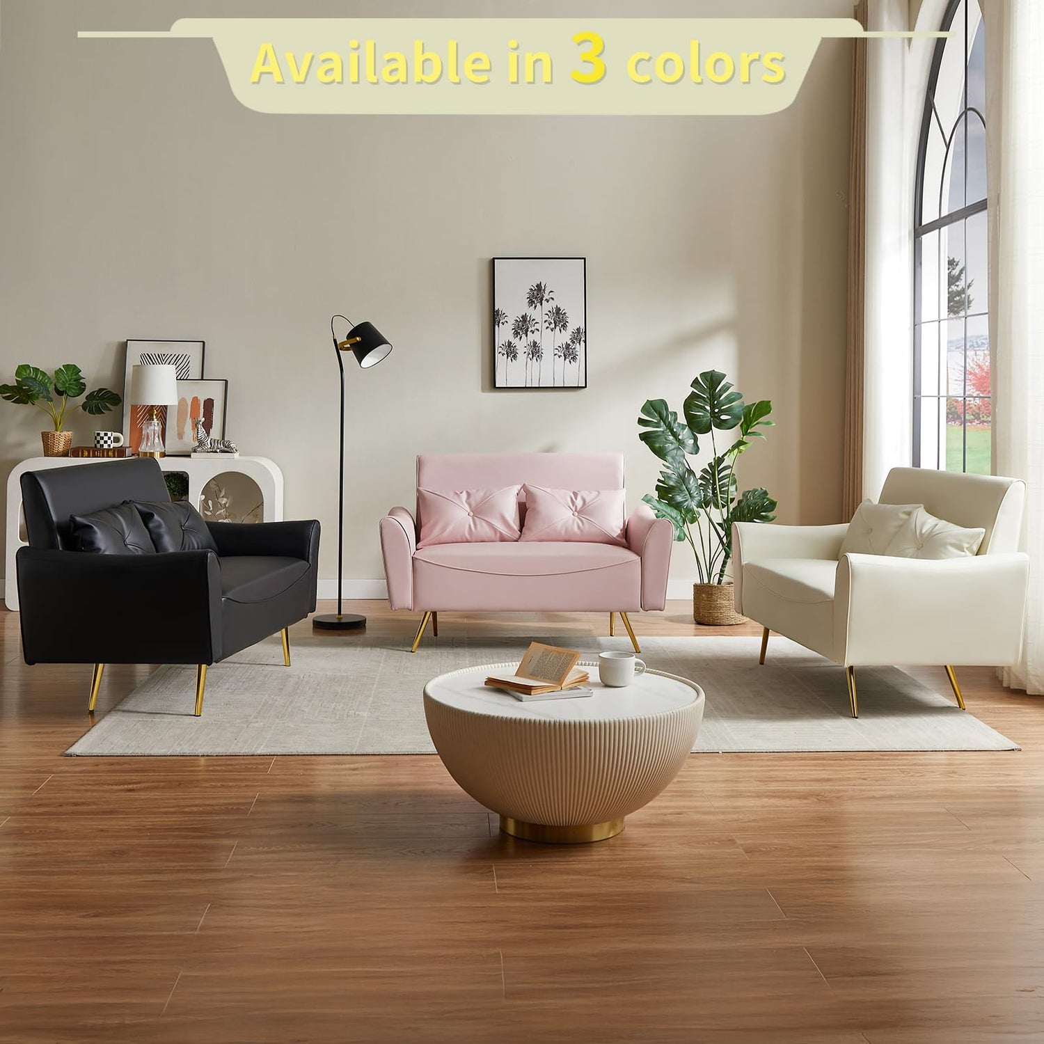 - DURABLE GOLD METAL FRAME: Gold-toned conical metal legs provide strong support, boasting high load-bearing capacity and resistance to deformation. These legs ensure long-term durability and add a touch of luxury, while the small loveseat offers a cloud-like seating experience for long hours of relaxation.