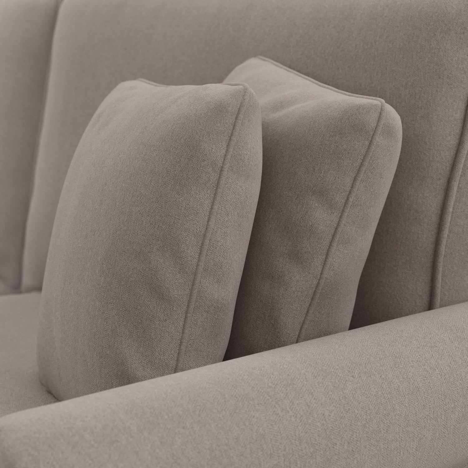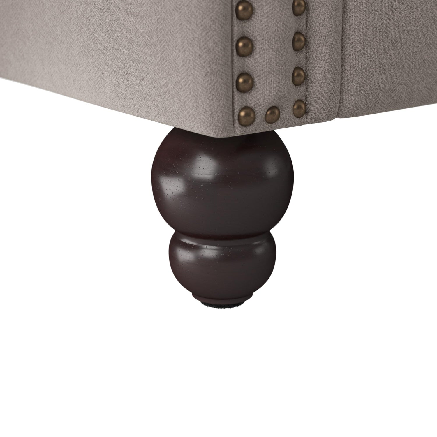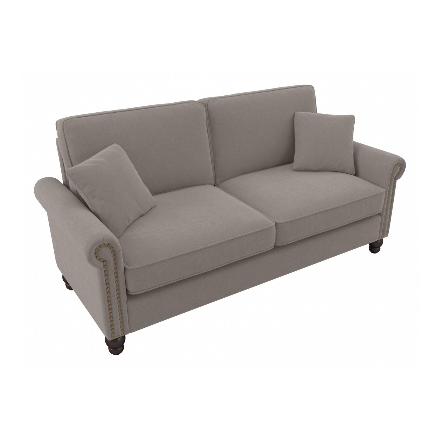 Details: The Bush Furniture Coventry 73 Inch Sofa presents a practical living room seating solution with remarkable quality and durability to match its classic style. Conveniently packaged for easy movement into and around any room or tight-fitting corridor, this ready-to-assemble two seater sofa with matching pillows is a great way to furnish a small apartment, large family home and everything in between. Relax with a good book or your favorite TV show on a small couch with high-density foam cushioning and pocket coil seat springs that maintain their shape and feel for years of comfort. Reversible seat and back cushions feature kid and pet-friendly StainGard(TM) fabric that repels dirt, oil, water and other liquids to prevent unsightly blemishes. The sturdy metal and wood framework includes a quiet sinuous spring design with cross supports that won't sag or shift over time. Espresso-stained rounded bun feet, rolled armrests and nailhead trim reflect a sophisticated style that perfectly complements French country, farmhouse, coastal and traditional decor. This living room sofa has been rigorously tested for safety, durability and stain resistance and is backed by the Bush Furniture 1 Year Manufacturer's Warranty.