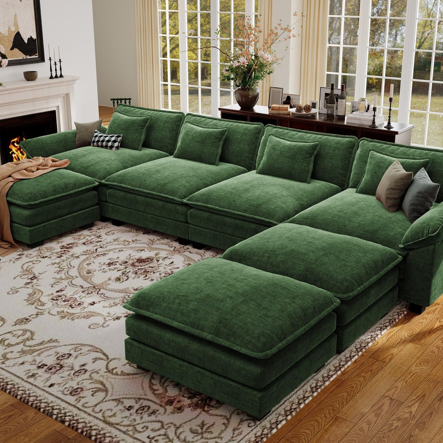 CDCASA 154" Oversized Modular Sectional Sofa, Comfy U-Shaped Cloud Couch w/ 3 Movable Ottoman, 7-Seater Chenille Deep Seat Modern Sofa Couch for Living Room, DIY Combination, Green