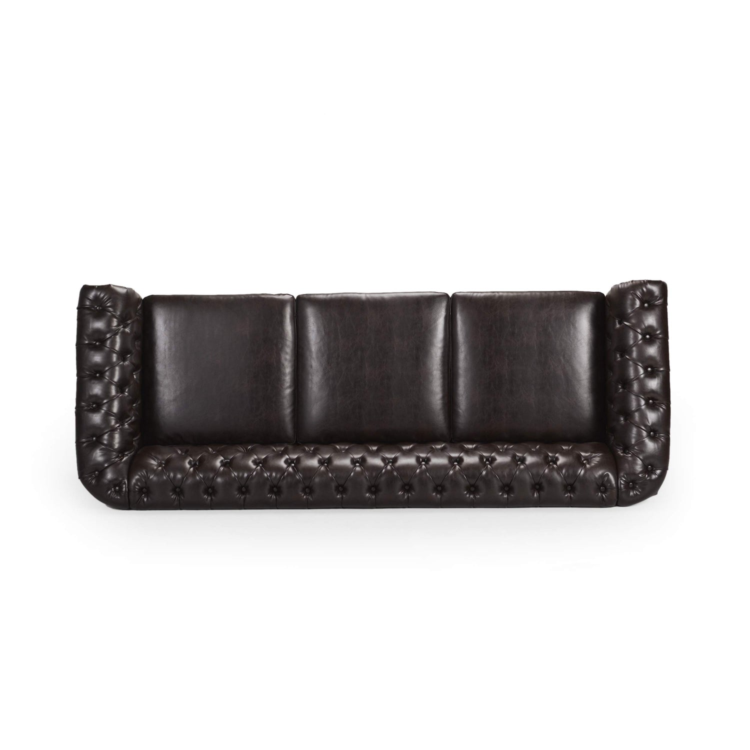 Details: Enrich your living room with an exquisite centerpiece that practically exudes royal-like luxury. This Chesterfield style sofa is the ideal addition to any living room with its classic design and traditional elements such as deep button tufting, scrolled arms, and nailhead accents. Featuring a low backrest and plush upholstery, this sofa stands as a streamlined statement piece that can change the whole flow of your living room, creating an open, clean space. Finished with beautifully turned legs, our sofa provides an elegant touch to any room. Includes: One (1) Sofa Material: Faux Leather Leg Material: Birch Color: Brown Leg Finish: Dark Brown Hand-Crafted Details Assembly Required Dimensions: 33.50 inches deep x 84.75 inches wide x 27.00 inches high Seat Dimensions: 23.00 inches deep x 67.00 inches wide x 18.75 inches high Arm Height: 26.00 inches