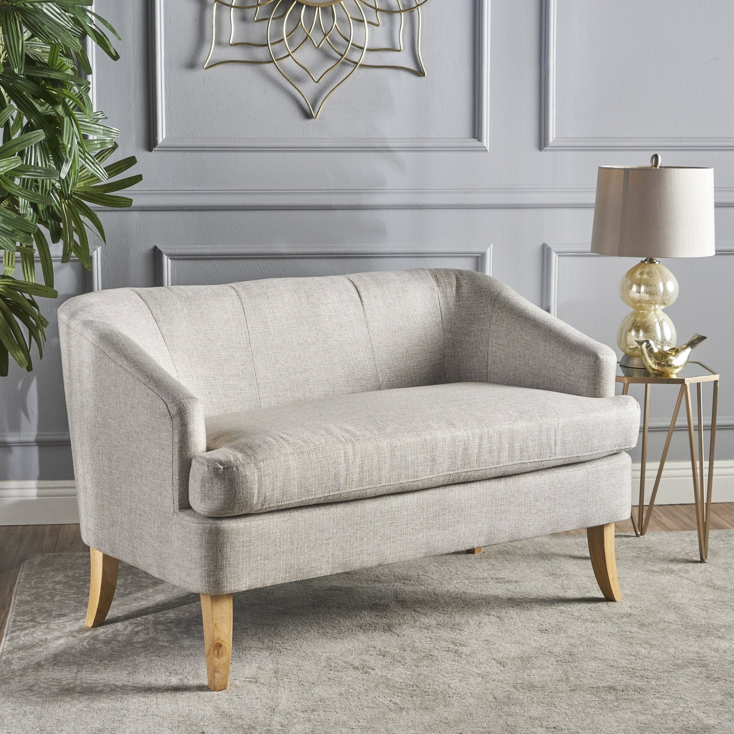Details: This uniquely-shaped love seat blends elegant design with the utmost in comfort. Perfect for those looking to add seating space without committing to a big bulky couch, This makes for an intimate and relaxing place to read a book or watch TV. Upholstered with the highest quality fabric, and set atop beautiful birch wood legs, this will be a favored addition to your home. Product details Includes: one (1) Loveseat material: Fabric composition: 100% polyester leg Material: Birch color Available in: Beige, Dark grey, or light Blue leg finish: natural some assembly required Dimensions: 29. 50"D x 49. 25"W x 30. 75"H Seat Width: 40. 50" Seat depth: 21. 25" Seat Height: 20. 50" Arm Height: 23. 75".