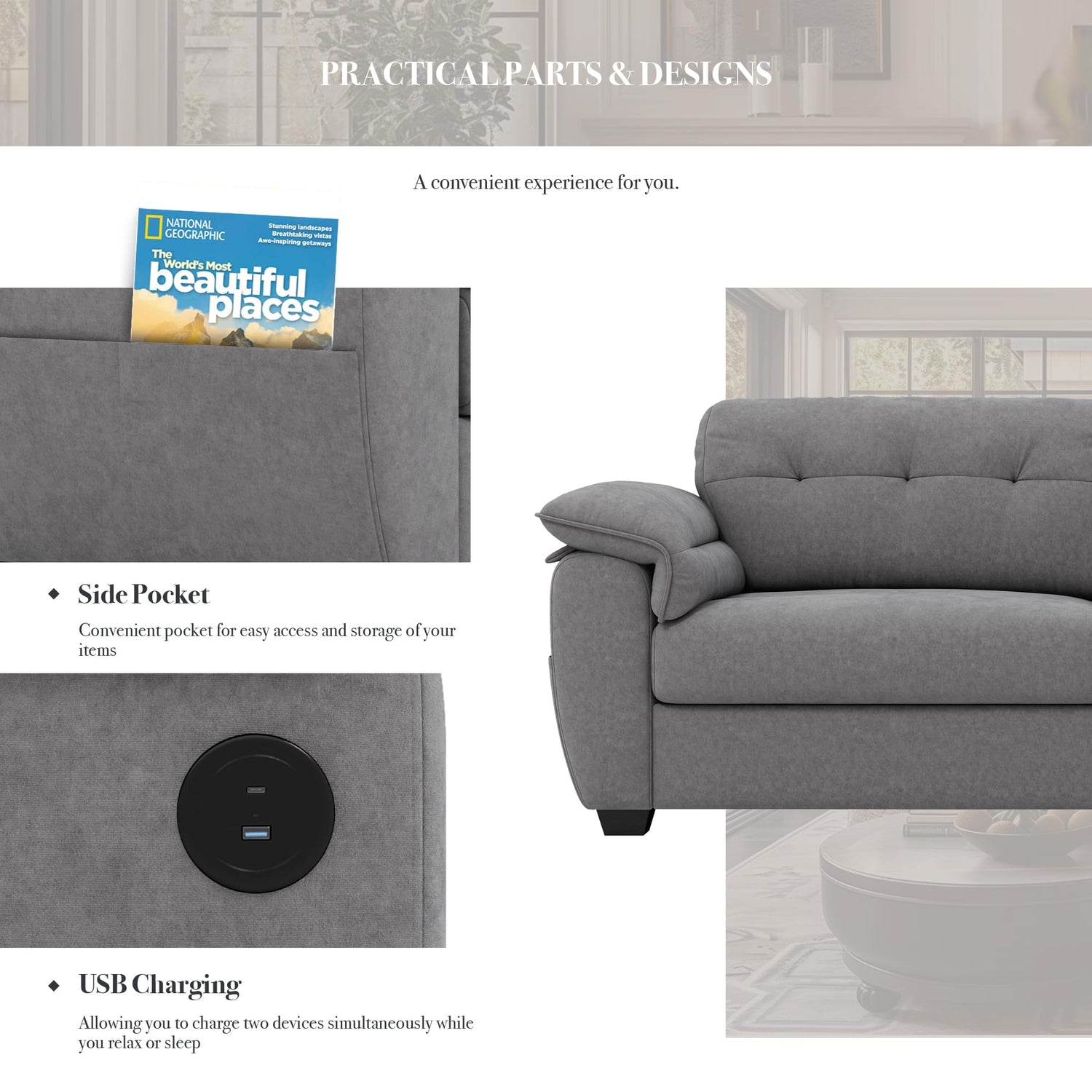 • PRACTICAL FUNCTION AND UPGRADED DESIGN: This three seat sofa is designed with practicality in mind, featuring USB and Type-C charging ports to charge two devices simultaneously. The thickened armrests come with convenient side pockets for easy storage and quick access to your items. Additionally, the armrest pillows and fabric covers are removable and machine washable, ensuring effortless maintenance