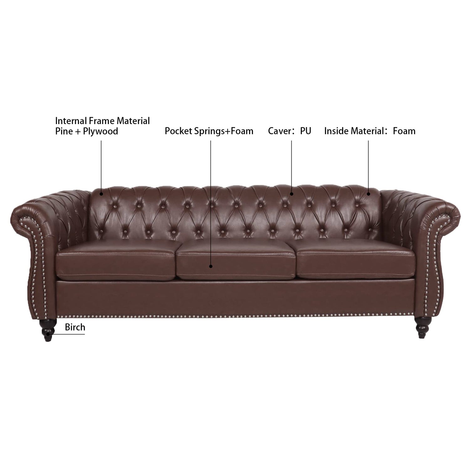 - Chesterfield sofa upholstered in exquisite PU leather, The upscale soft PU leather surface is elegant in texture, easy to care for, and won't wrinkle like fabric sofas. It features a beautiful round armrest with a graceful arc. The button tufting adds a classic and exquisite touch, while willow nails handcrafted by artisans give it a modern look.