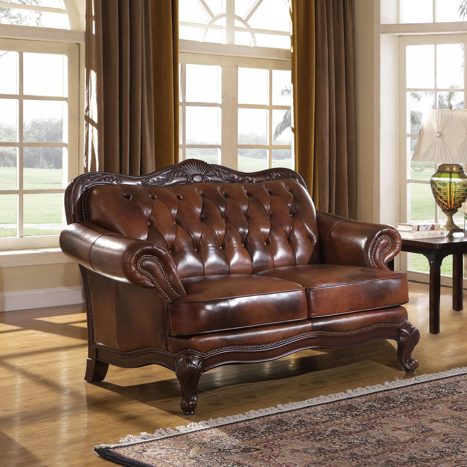 Details: Bring refined charm to your classic home space with this brown loveseat, featuring rolled arms, a sculpted button-tufted backrest, and elegant cabriole legs. Upholstered in luxurious top-grain leather, this full leather loveseat is accented with brass nail heads and decorative moldings for traditional flair. The generous and supportive frame make it perfect for living and family spaces or a cozy study room or den. Finished with ornate feature trim, this upholstered loveseat is a timeless addition to any curated home furnishing setup.