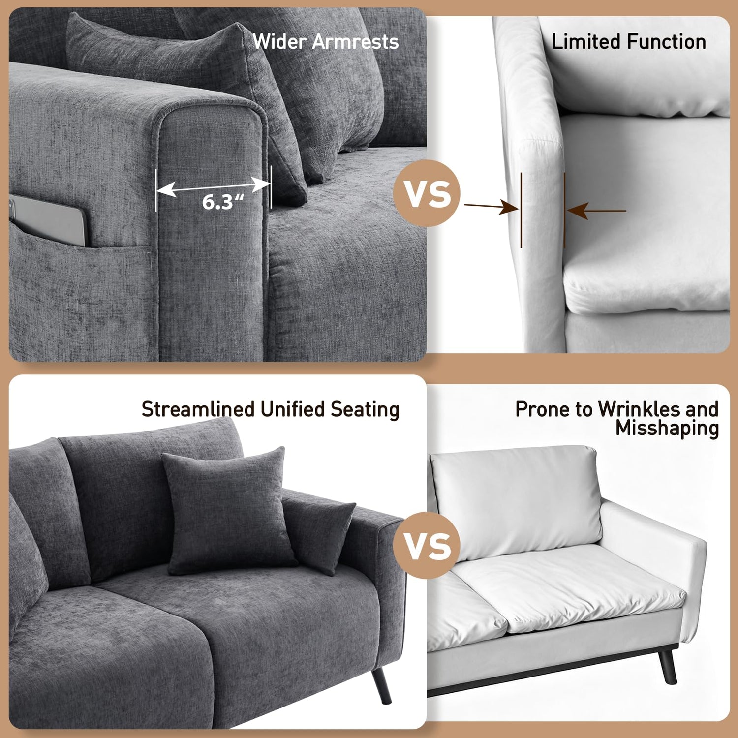 - 【Compact Size, Full Comfort】Though designed for smaller spaces, this comfy couches for living room offers generous room for 2–3 people to sit comfortably. With a 22”deep seat depth and 20” seat height, this living room couch supports relaxed lounging while making it easy to sit down and stand up. The 6.3”wide armrests are perfect for resting your arms, holding a phone, or simply relaxing with a drink in hand.