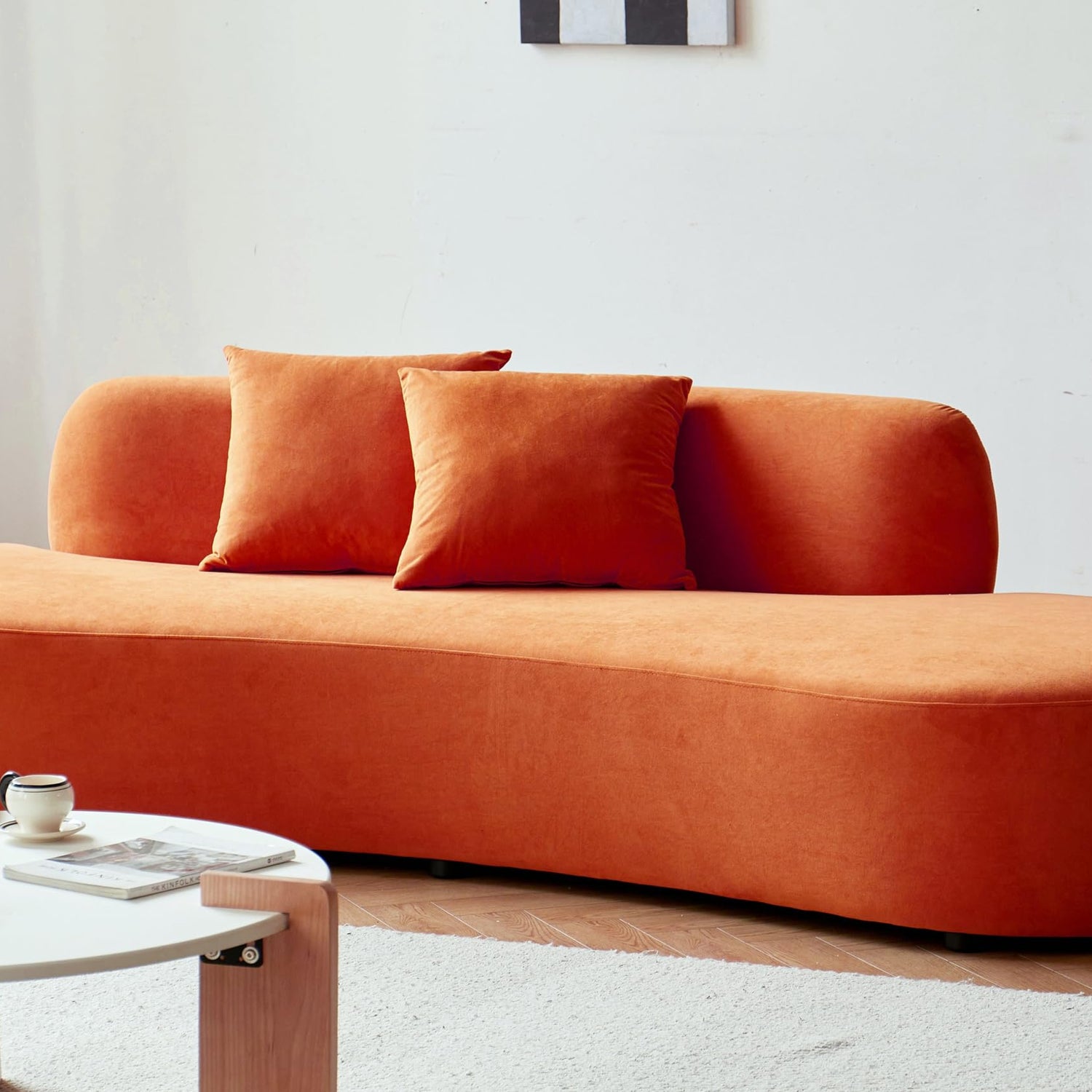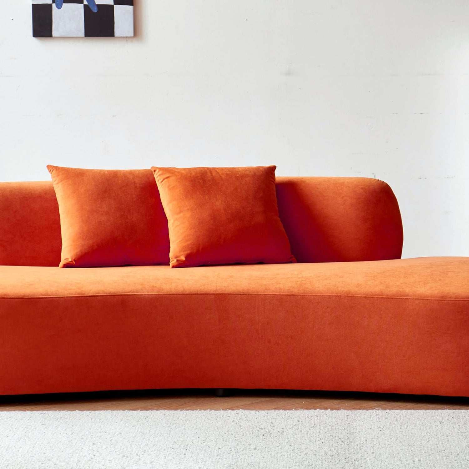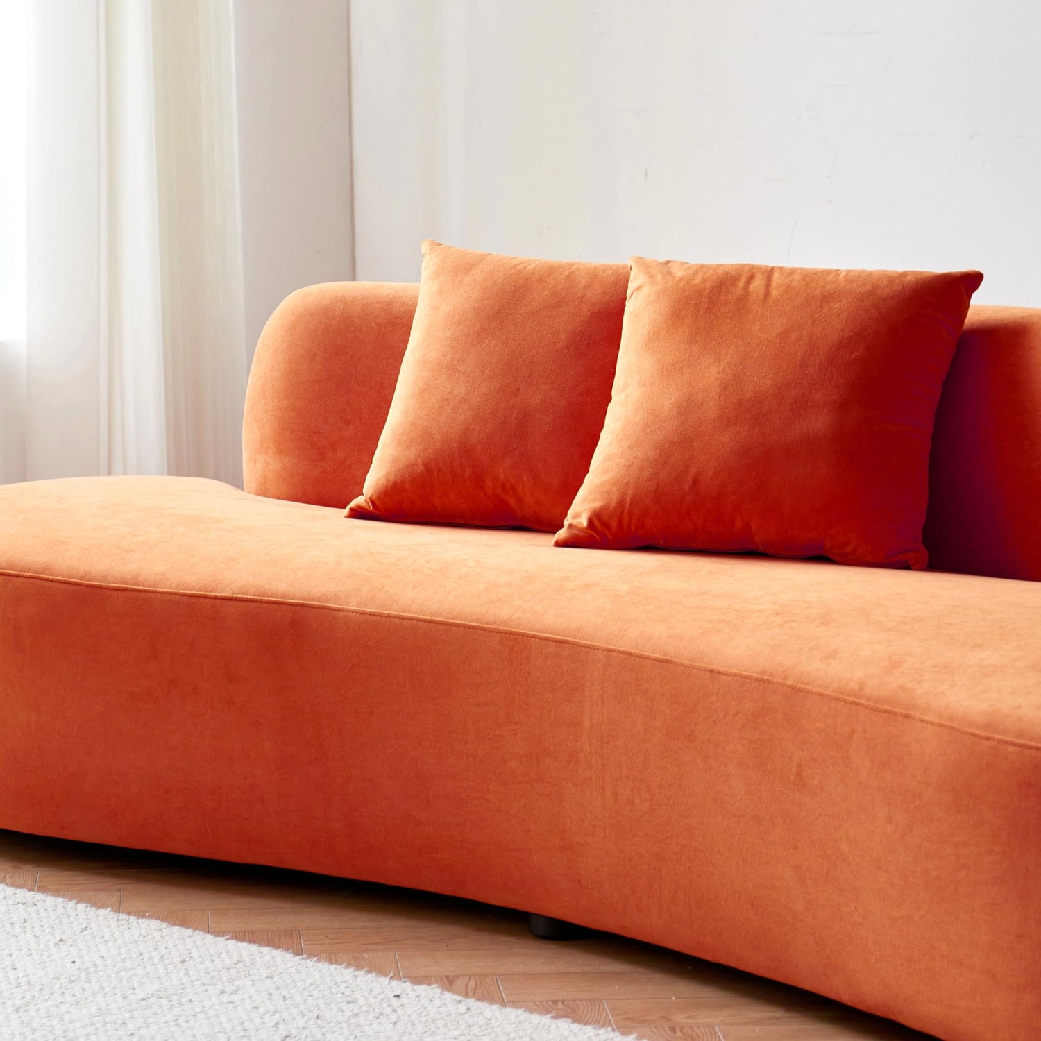 Details: Elevate your living room furniture with our elegant 90.2'' modern curved sofa. This contemporary sofa boasts a unique half-moon design, providing both aesthetic appeal and ergonomic comfort. Upholstered in luxurious, soft-to-the-touch velvet fabric available in Black, Red Orange, and Ivory, this modern couch is the epitome of style and sophistication. With its spacious 4 seater couch design, this plush couch offers ample seating for family and friends, making it perfect for any apartment or home. The high-density foam filling ensures this soft couch maintains its shape and provides exceptional support, delivering a comfy sofa experience. Whether you're looking for a minimalist couch to complement your decor or a statement piece to transform your space, this upholstered sofa fits the bill. Its sleek lines and modern aesthetic make it a versatile addition to any contemporary setting. Enhance your living space with this stunning curved sofa couch, combining ultimate comfort and chic design for the perfect living room centerpiece.