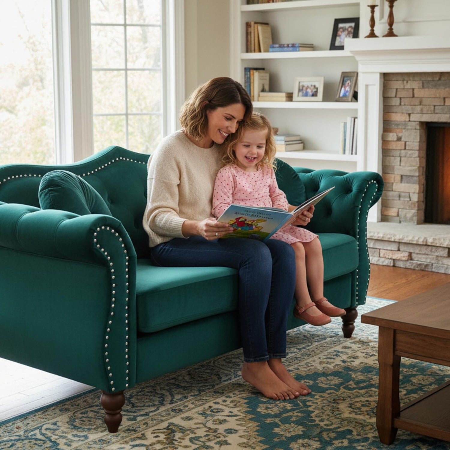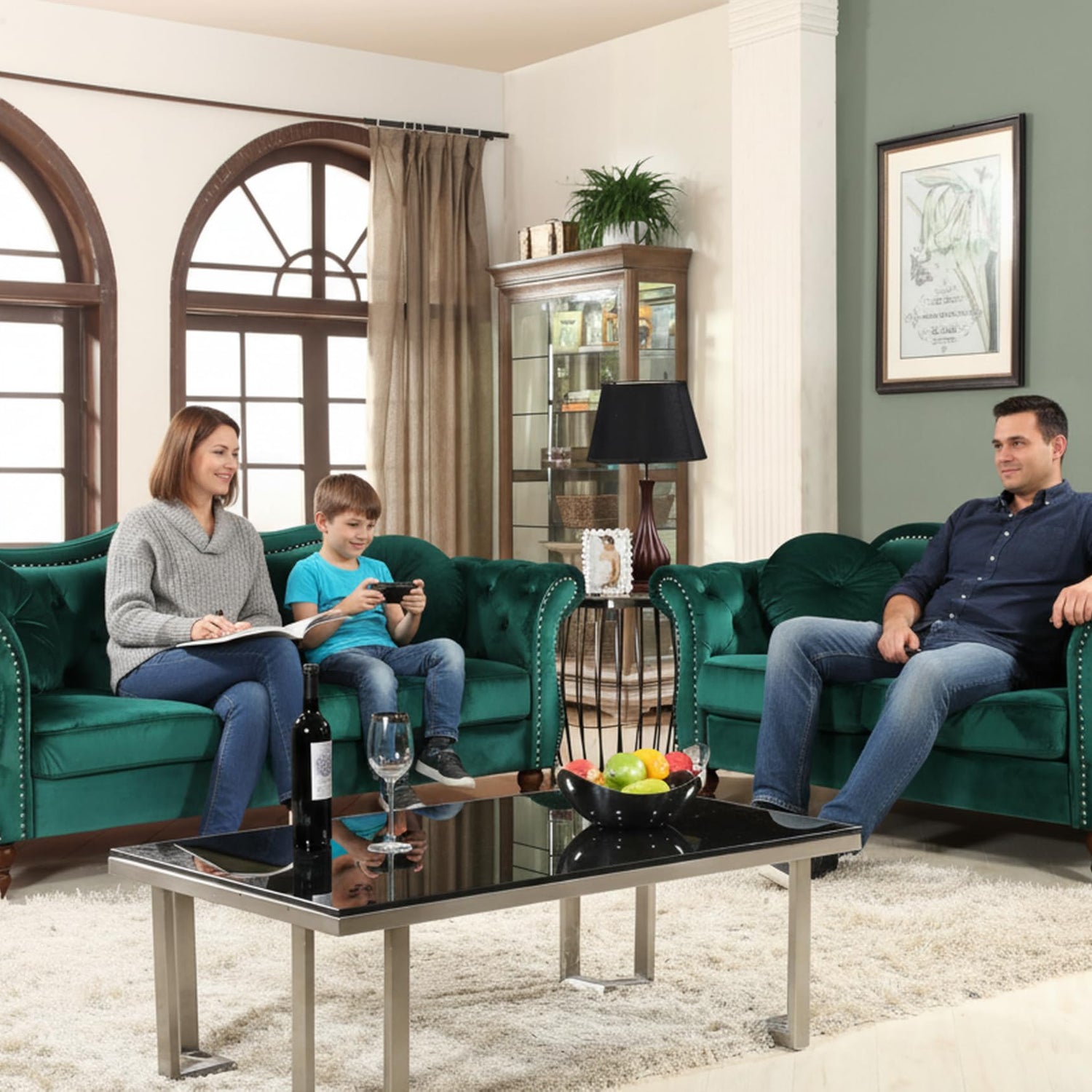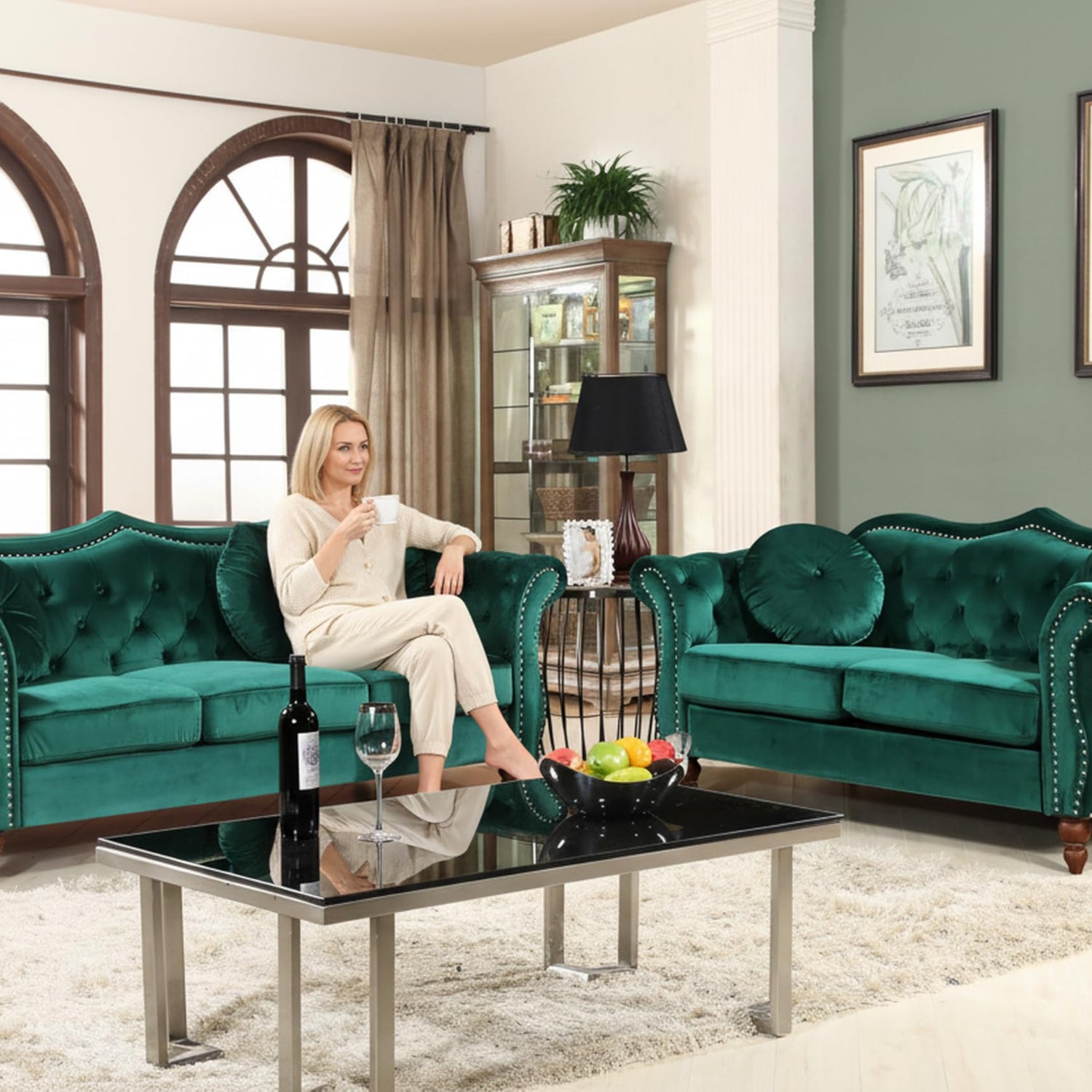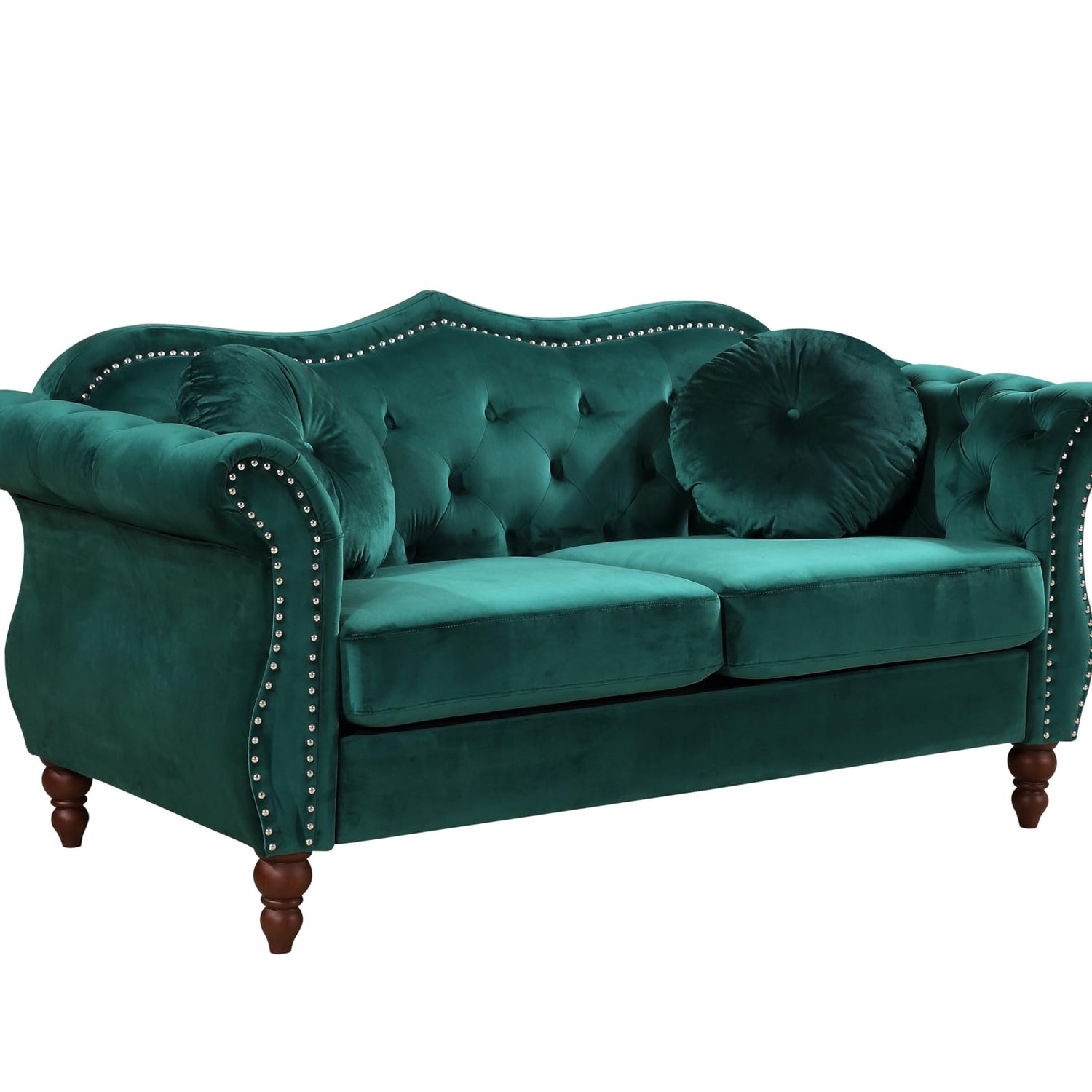 Container Furniture Direct Anna1 Chesterfield Velvet Couches for Living Room, Button Tufted Luxury Upholstery with Rolled Arms, High-Density Foam, Durable Wood Frame, 65.5" Loveseat, Green