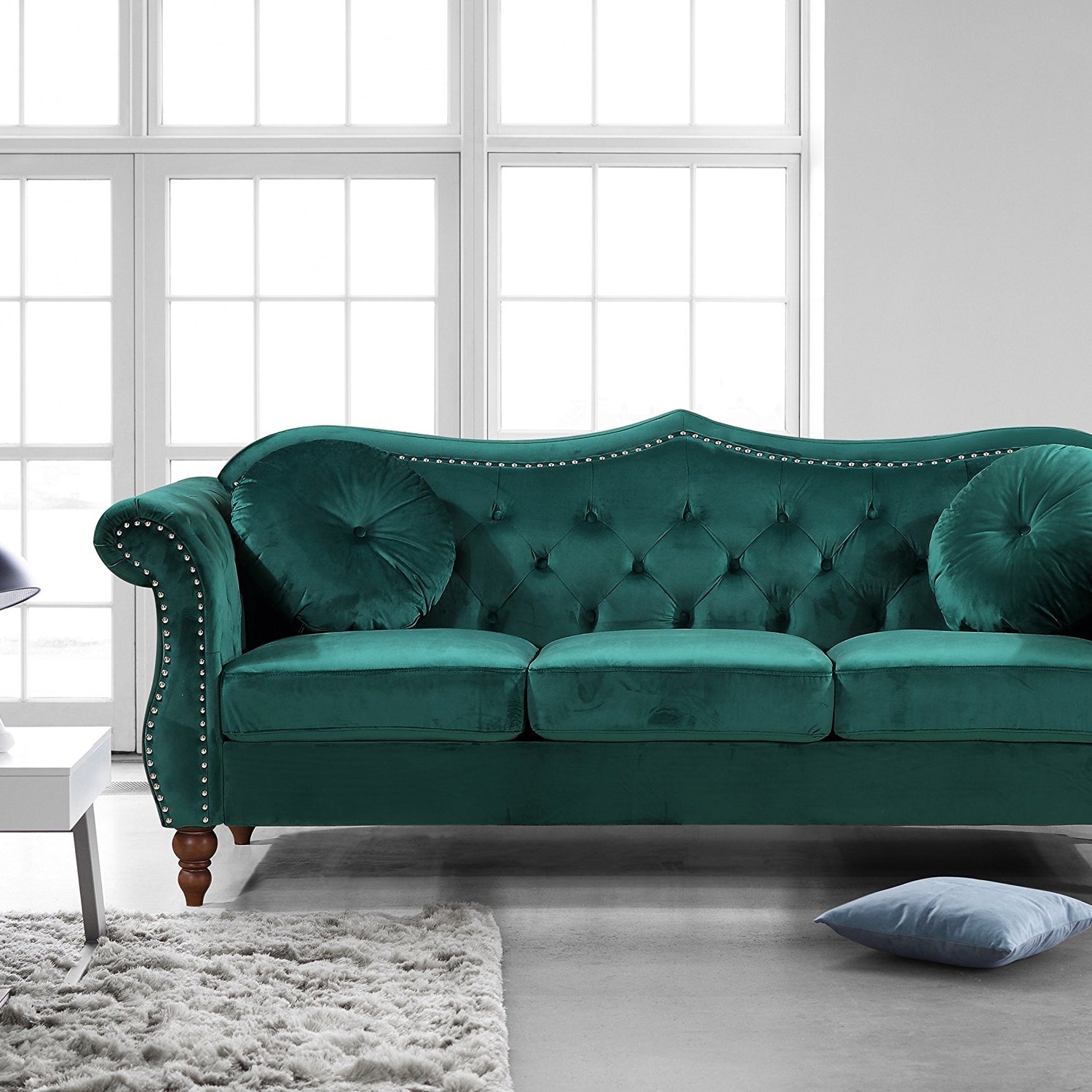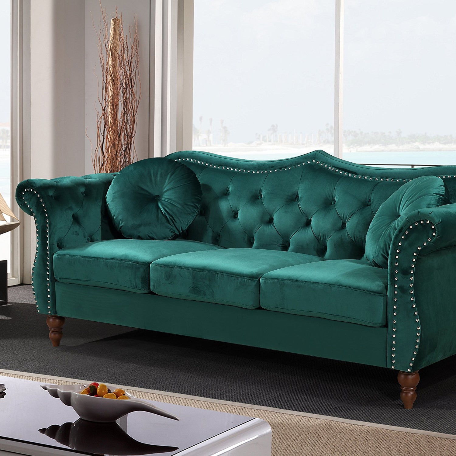 Container Furniture Direct Anna1 Chesterfield Velvet Couches for Living Room, Button Tufted Luxury Upholstery with Rolled Arms, High-Density Foam, Durable Wood Frame, 79.5" Sofa, Pine Green