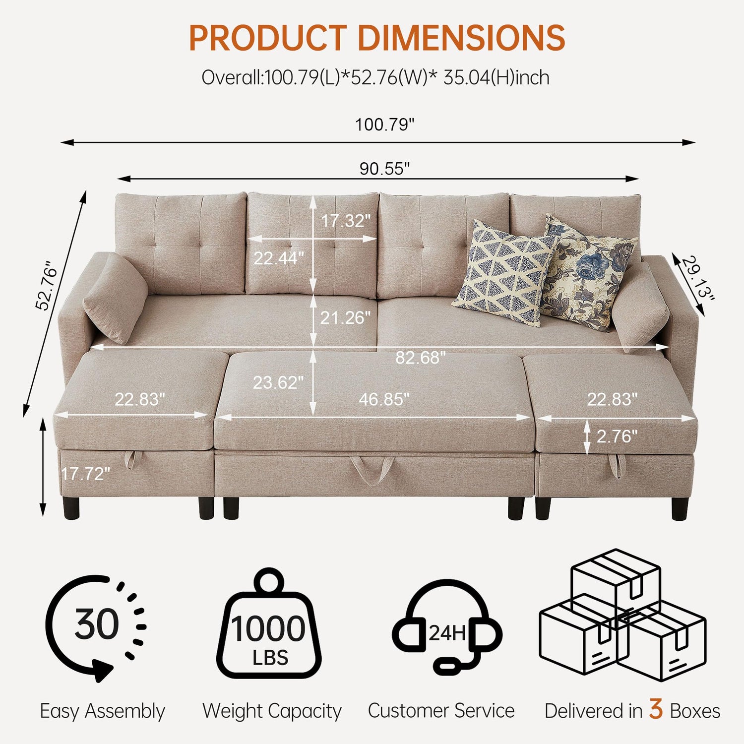 Convertible Sectional Sleeper Sofa with Storages, 100" U Shaped 4 Seater Couch with 2 Movable Ottomans and 1 Ottoman Bench Polyester Fibre for Living Room, Beige